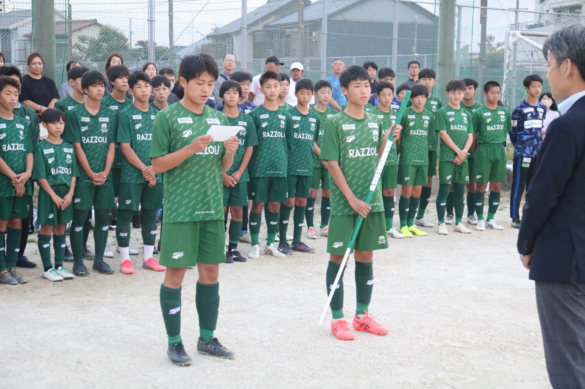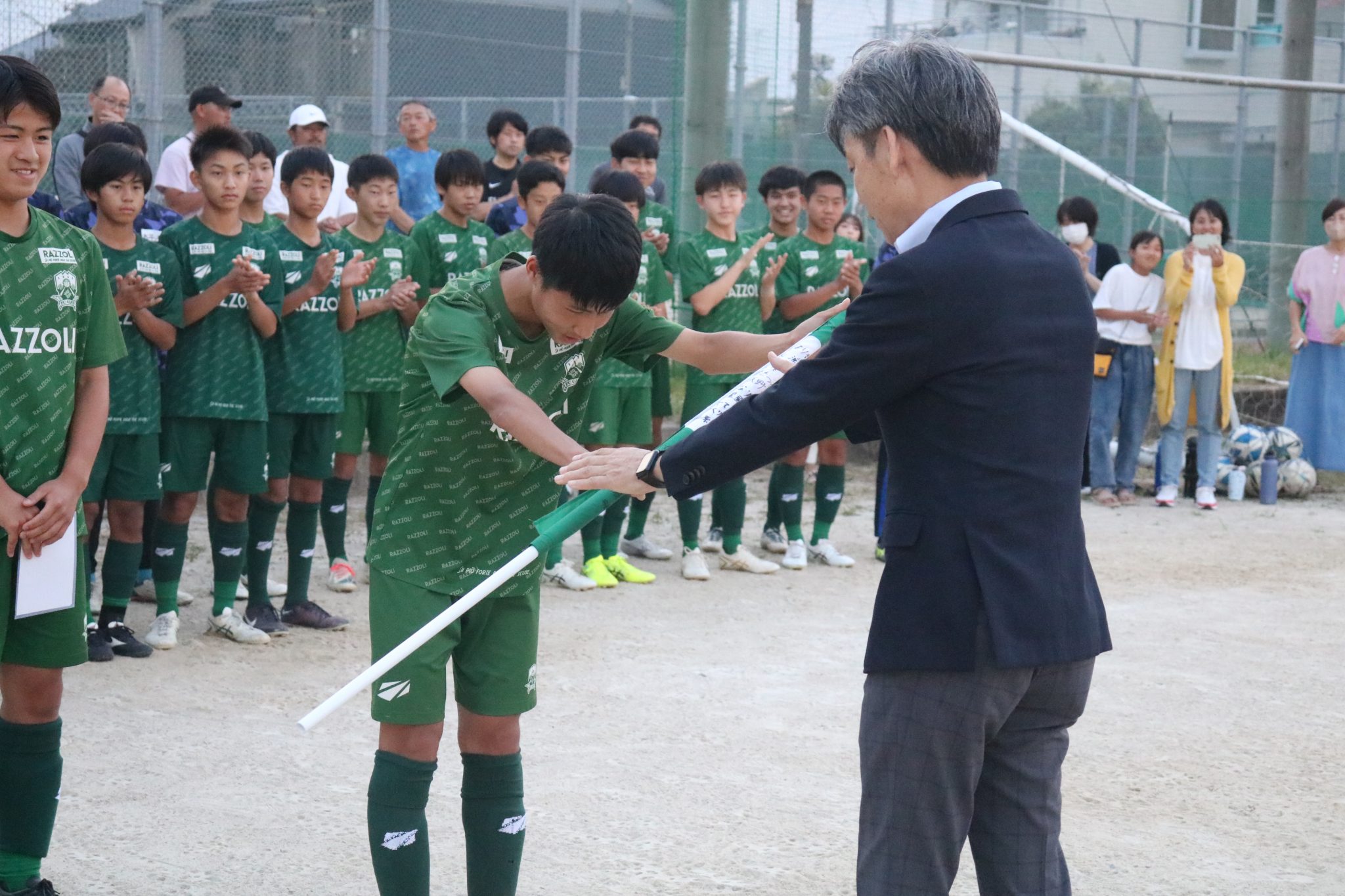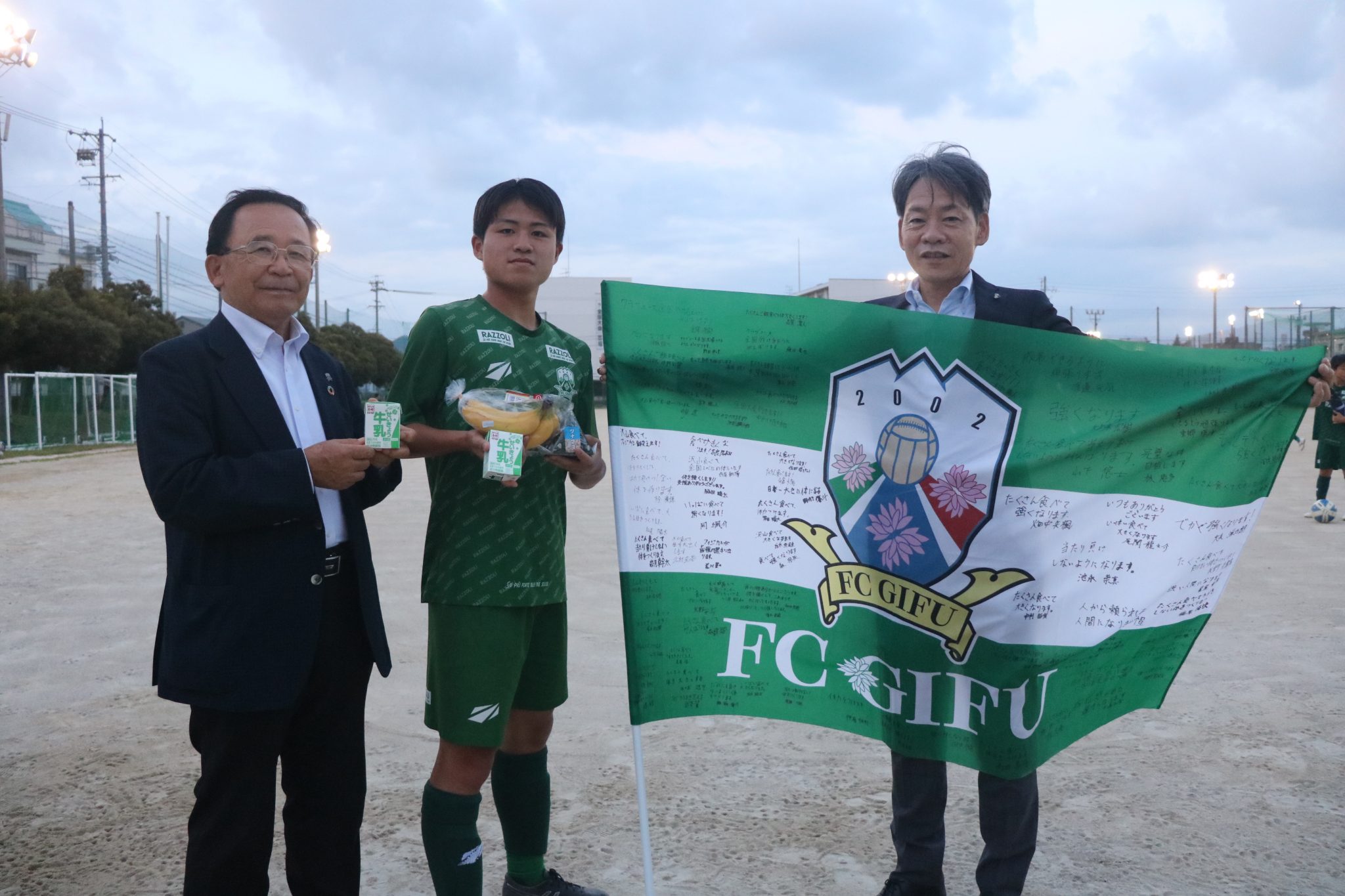 選手を代表して、U-15キャプテンの畑田 陽登選手から感謝を申し上げ、選手が決意を書き込んだFC岐阜フラッグをお渡しさせていただきました。