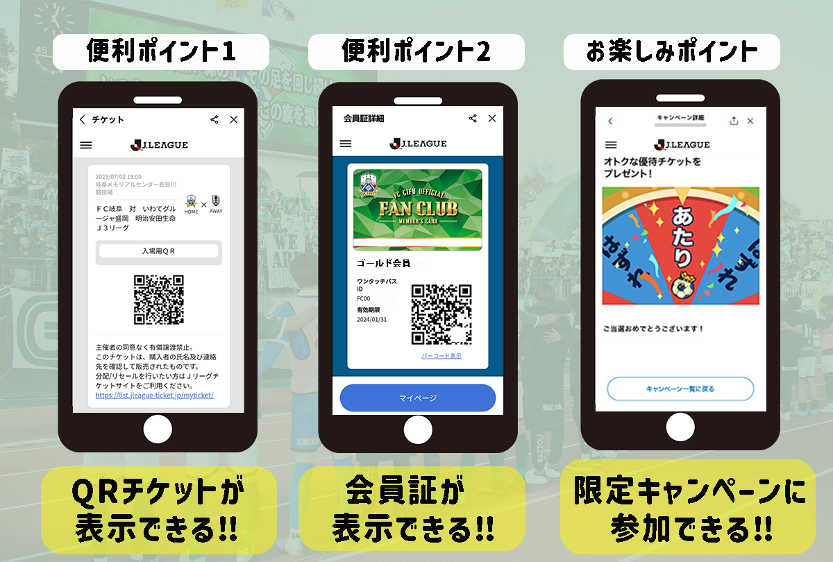FC岐阜LINE公式アカウントのメニューから、ワンタッチパス会員証を表示することができるようになります。表示した会員証を用いて、シーズンシートオーナーは入場することが可能です。ファンクラブ会員は、ワンタッチパス端末で来場記録をつけることが可能です。