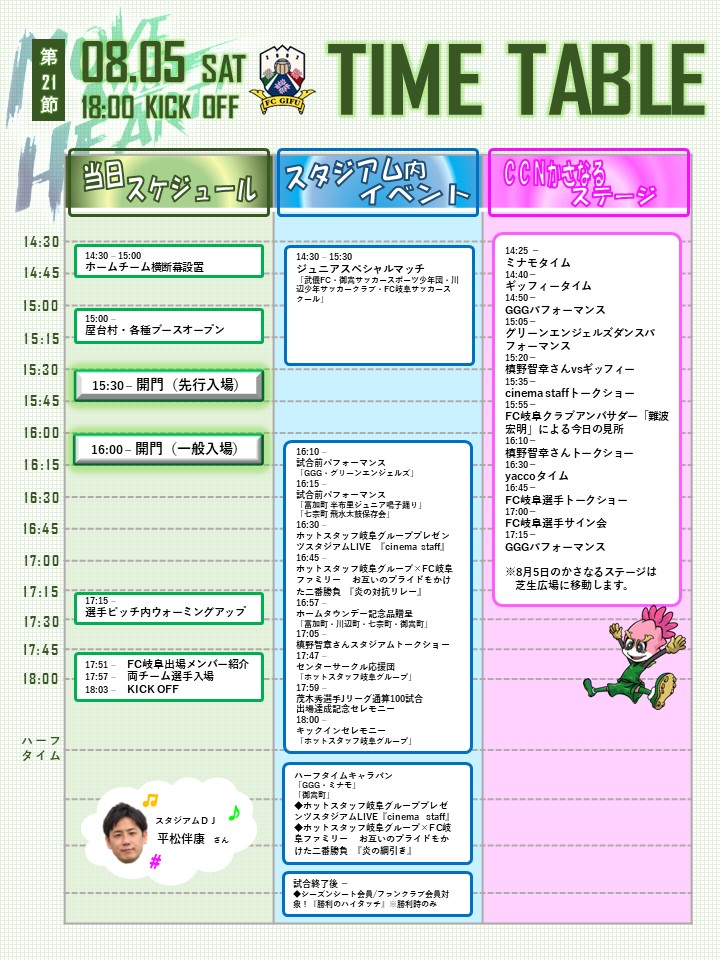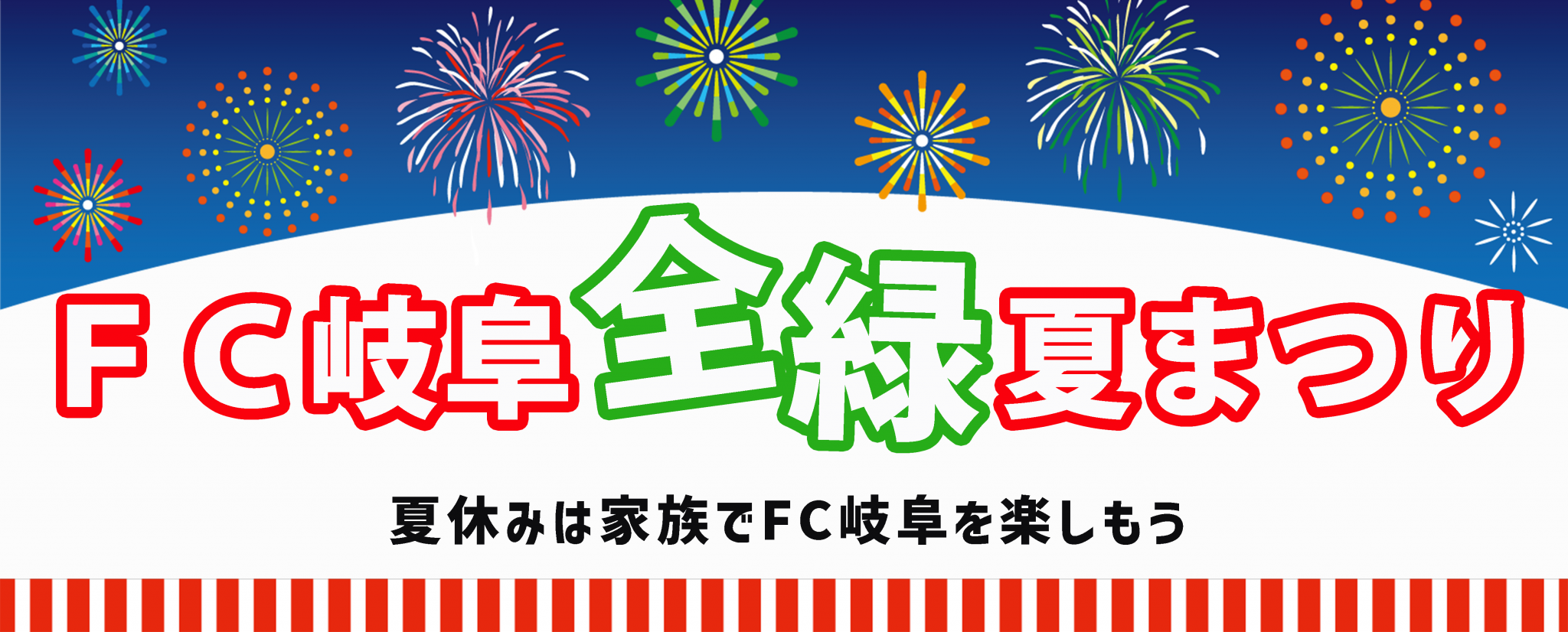 『オリジナルギッフィーTシャツ』 入場ゲート先着5,000名様にプレゼントいたします。お受け取り方法はこちらをご確認ください。 ②保護者様が使える観戦チケットプレゼント! わくわくワークショップ パートナー企業様による「わくわくワークショップ」が登場!!楽しみながら岐阜の魅力を再発見♪ 縁日ブース 夏まつり定番の縁日ブースを楽しもう♪ 夏まつりグルメ&ワンコインビールまつり お祭りの楽しみといえば…なんといってもグルメ!! 夏まつりにぴったりなグルメが屋台村に登場します♪ ホットスタッフ岐阜グループ×FC岐阜ファミリー お互いのプライドをかけた二番勝負 『炎の対抗リレー』『炎の綱引き』で本気の勝負をします。 ■炎の対抗リレー ホットスタッフ岐阜グループプレゼンツスタジアムLIVE FC岐阜オフィシャルサポートソング「HYPER CHANT」を歌うcinema staffが2018シーズンぶりに長良川競技場に来場!スタジアムLIVEで会場を盛り上げます! ■トークショー ■スタジアムライブ来場者プレゼント