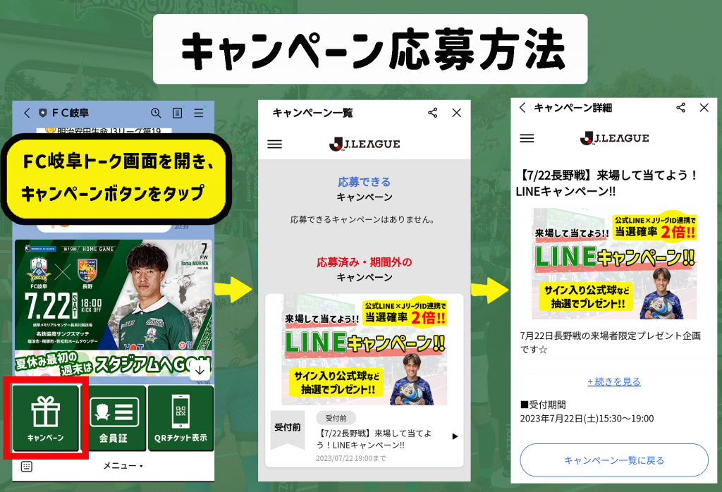 FC岐阜公式LINEアカウントをお友達登録して、 メニューの「キャンペーン」バナーよりご参加ください。