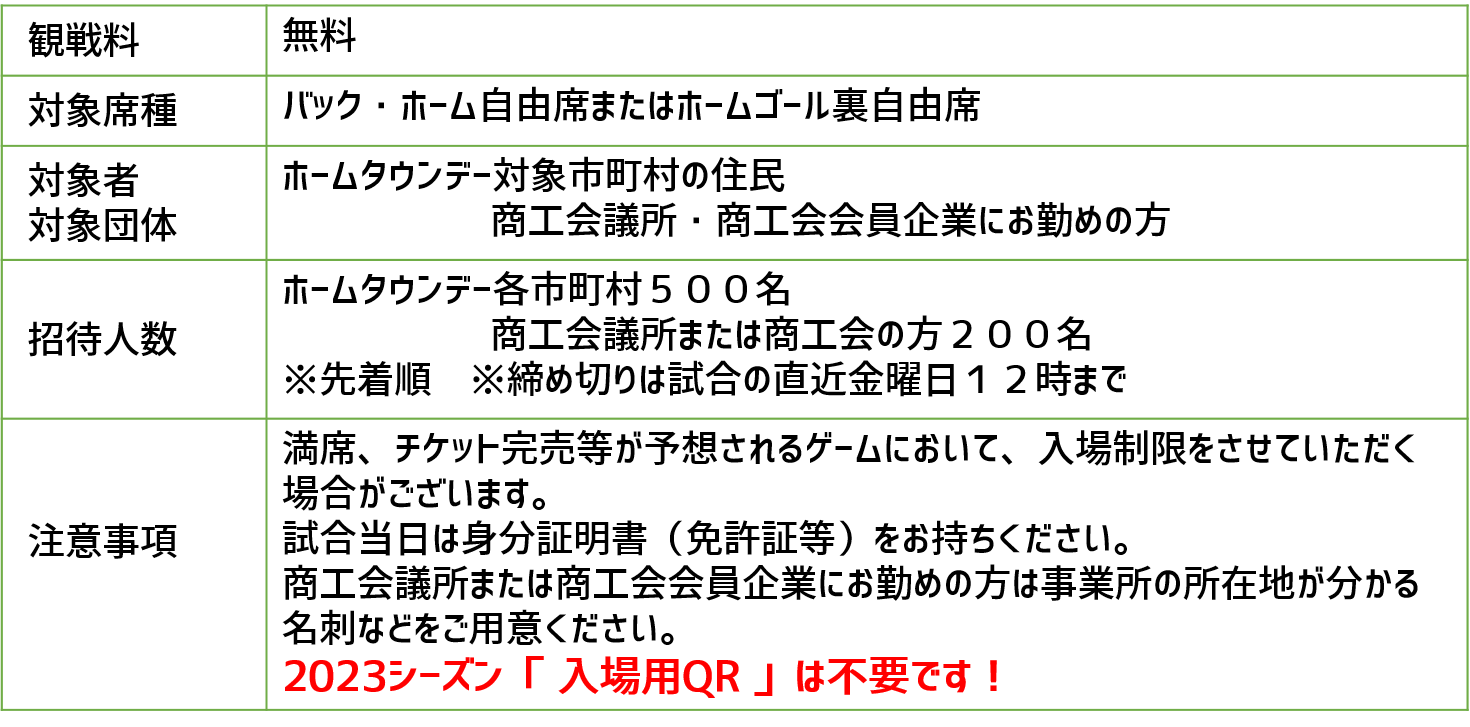 「ともチケ」はホームタウンデー開催市町村にお住いの皆さま、開催市町村の商工会議所・商工会の会員企業にお勤めの皆さまをご招待する体験チケットです。