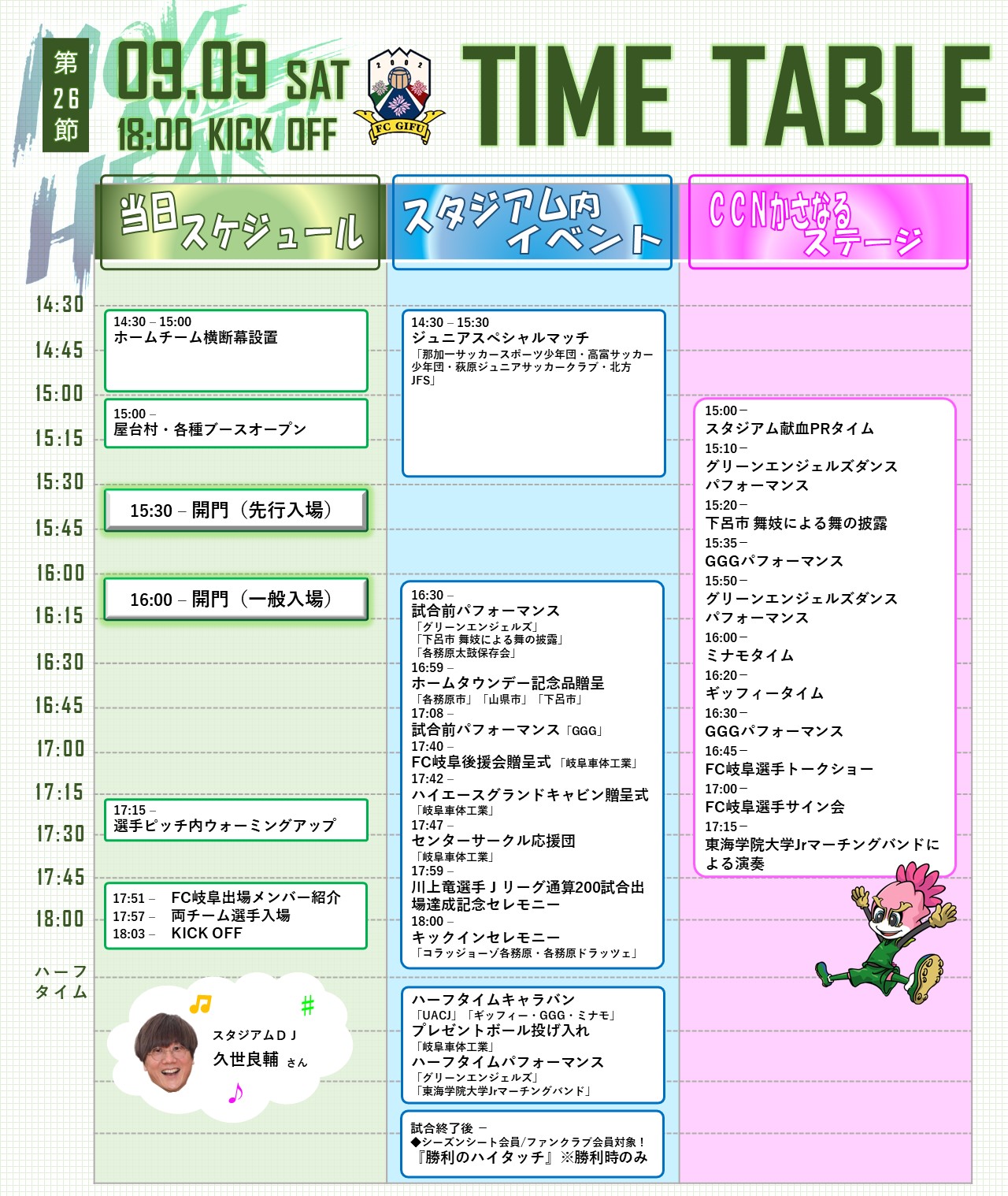 岐阜車体工業ブース 生産車両(メガクルーザー、コースター、ハイエース)の展示と、ハイエースのキッチンカーでカレーパン・シュークリーム・スムージーの販売をおこないます。 UACJコラボアルミカッププレゼント! 世界トップクラスのアルミニウム総合メーカーである株式会社UACJ 様ご提供「FC岐阜コラボアルミカップ」を入場ゲートにて先着600名の方にプレゼントします。 UACJコラボサッカーボールごみ袋プレゼント! ごみを入れて結ぶとサッカーボールになるごみ袋を配布します! 各務原市グルメ・観光PRブース 各務原キムチフランク、アユの塩焼きなど、各務原市の美味しいグルメの販売をおこないます。 山県市グルメ・観光PRブース 山県ハヤシ(ハヤシライス)、山県市の美味しいグルメの販売をおこないます。 下呂市グルメ・観光PRブース エゴマ入五平餅・しらさぎ物語・飛騨牛肉みそ・朴葉みそ・龍の瞳(ブランド白米)など下呂市の美味しいグルメの販売をおこないます。 トヨタホームブース 明治安田生命 健活ブース フードドライブ FC岐阜×バローホールディングスwith岐阜県for子どもの居場所応援センター 東海学院大学Jrマーチングバンドによる演奏 スタジアム献血 ホンダカーズ岐阜応援ブース -前回の様子- シーズンシート会員・ファンクラブ会員対象「勝利のハイタッチ」※勝利時のみ 15:00 15:10 15:50 15:20 15:35 16:30 16:00 16:20 16:45 FC岐阜選手トークショー 17:00 17:15 15:00~18:00 サンサンデッキ 芝生広場東 FC岐阜スタジアムグッズ売店 ー 桃太郎製菓 キャンディ&パラパラまんがメモ帳 ー ー コラボアルミカップ ー ー サッカーボールごみ袋 ー ー 各務原キムチカレー ー ー 各務原キムチ取扱店 食事券3,000円 ー ー オアシスホール ペア招待券 ー ー アクア・トトぎふ 無料招待券5組10名 ー ー かじゅえりー ー ー みとかnoいちごジャム ー ※試合終了後のお渡しとなります。インフォメーションブースに引換券をお持ちください。 ー 素肌美人セット ー ー 下呂温泉みすと(小) ー ー 下呂温泉リップクリーム ー ー 下呂温泉ハンドクリーム(小) ー ー 下呂温泉タオル ー ー フランボワーズ ドーナツ1箱(5個入り) ー ※インフォメーションブースに引換券をお持ちください。 ー マフラータオル らぁめん麺彩家 ー