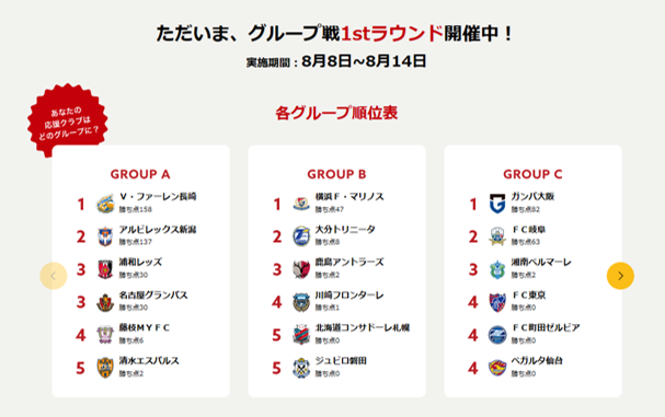 その結果の点数や、各Jクラブが発信するツイートへのリアクション数に応じて応援するクラブに「勝ち点」が付与され、合計が最も高いクラブが優勝となります。