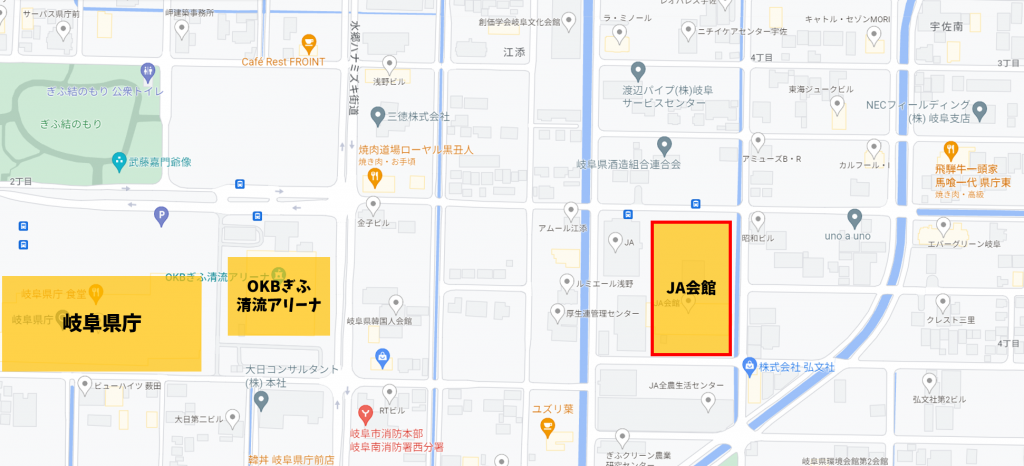 「OKBぎふ清流アリーナ(西側)」から「JA会館」と変更になっております。
