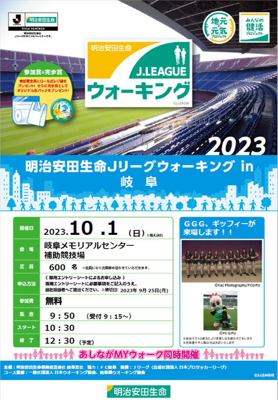 毎回ご好評をいただいております、FC岐阜のオフィシャルパートナーである「明治安田生命 岐阜支社」様 主催の『明治安田生命Jリーグウォーキングin岐阜』を開催いたします。