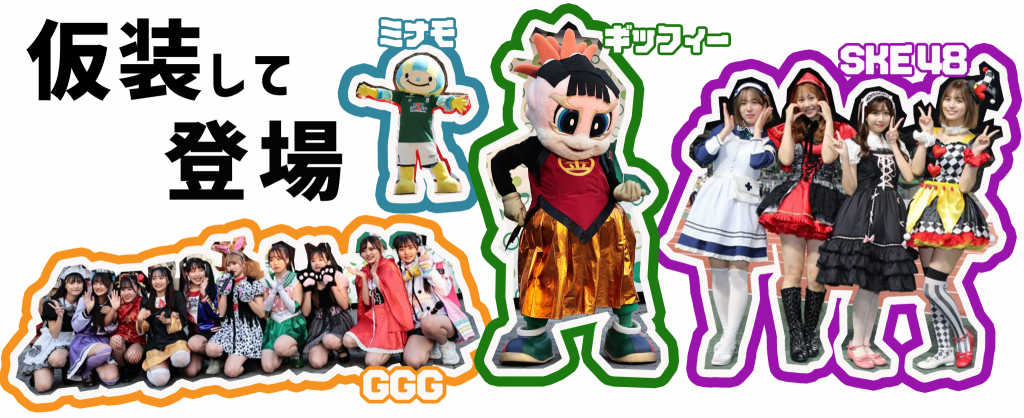 ギッフィー、ミナモ、GGG、FC岐阜応援隊・SKE48のメンバーもハロウィン仮装をしてスタジアムに登場!FC岐阜ファミリーと一緒にスタジアムのハロウィンを楽しもう♪