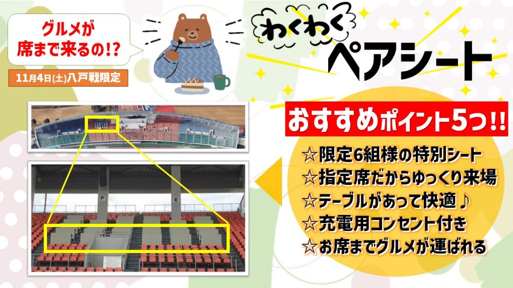 関商工ぽっぽ乗車会 「関商工ぽっぽ」とは、関市立関商工高校機械科が製作した電動機関車です。 Nゲージ運転体験・鉄道のおもちゃで遊ぼう! 岐阜大学名岐鉄道同好会が製作した鉄道模型の展示・運転体験ができます!また、自由にレールをつないで車両を走らせて遊べるブースも登場! 1.【観戦&グルメがセットでお得!!】屋台村券付きチケット 観戦チケット+屋台村「2,000円分」の金券がセットになったお得な「屋台村券付きチケット」です。秋と言ったら「食欲の秋」!食べ物がおいしいこの季節、FC岐阜屋台村グルメを目一杯楽しもう♪ 2.【お席に屋台券グルメが届く!!】ゆったりペアシートチケット テーブル&コンセント付きのゆったりペアシート!! お席にグルメが運ばれてくる特別なお席です。6組様限定の特別なお席で試合観戦を満喫しよう♪ 甘いものは別腹!食欲の秋にスイーツを楽しもう!