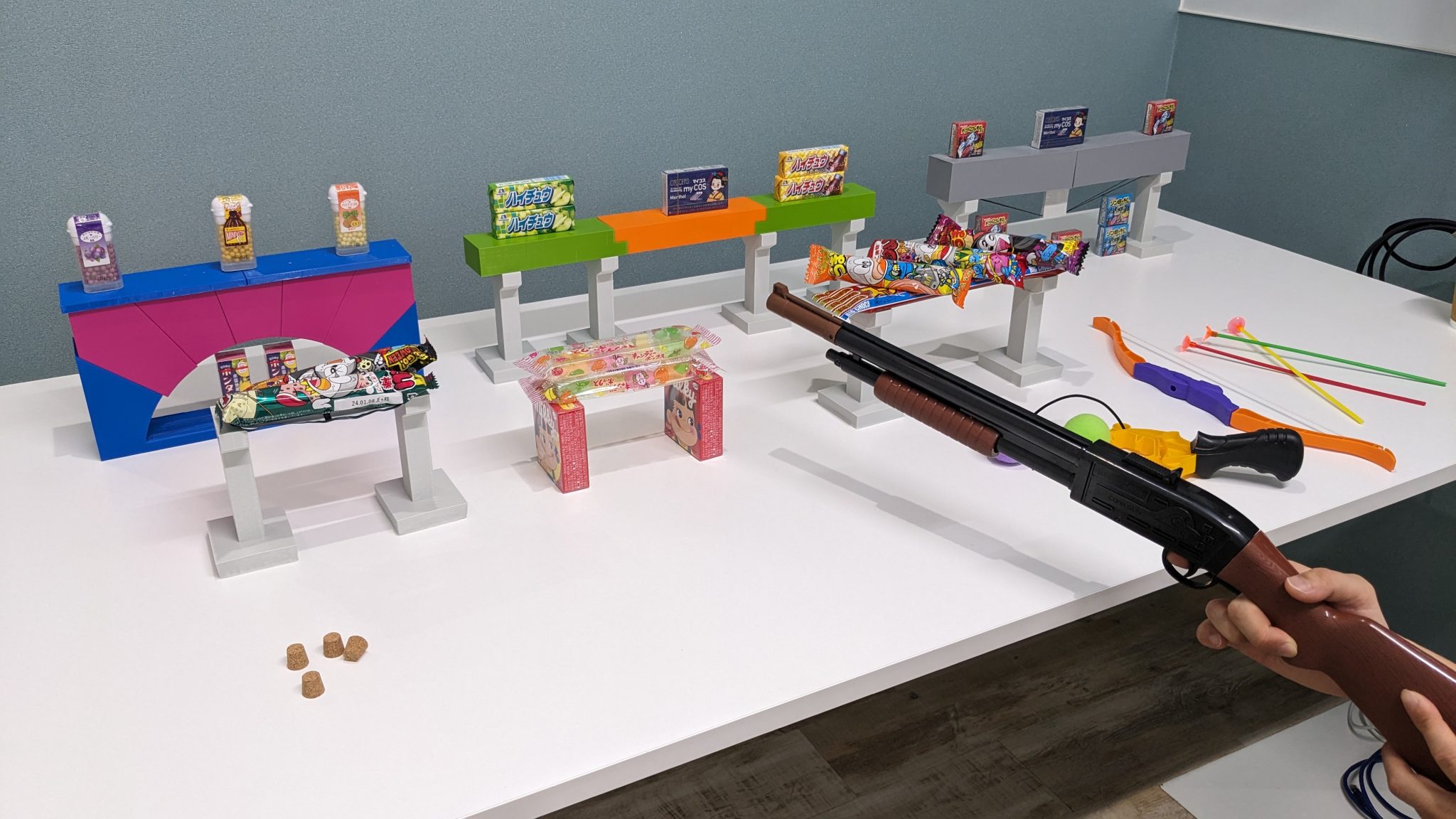 3Dプリンタやお菓子で組み立てた橋の上にある景品をゲットしよう!