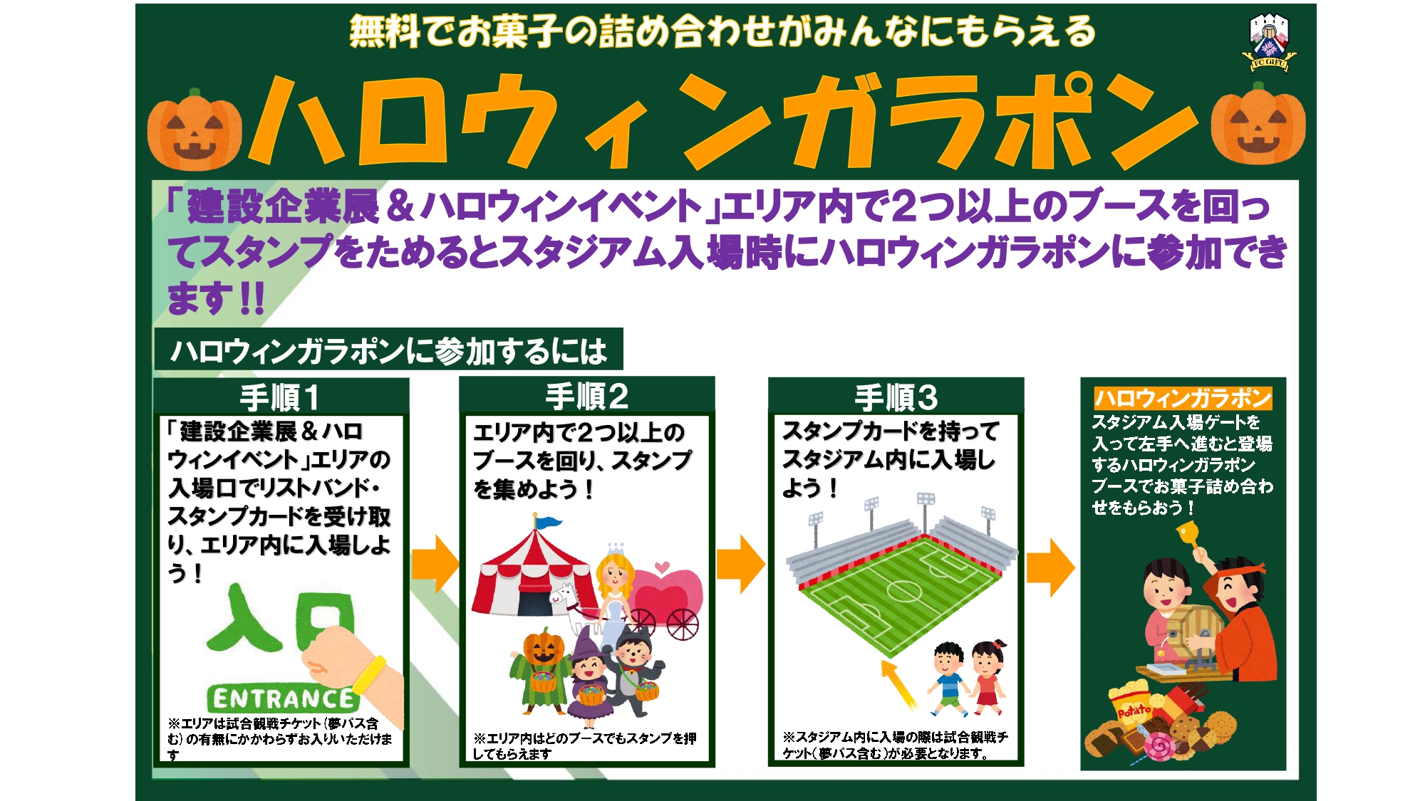 2つのスタンプを集めて、スタジアム入場ゲート内特設ブースで「ハズレなし!お菓子が当たるハロウィンガラポン」にご参加いただけます。