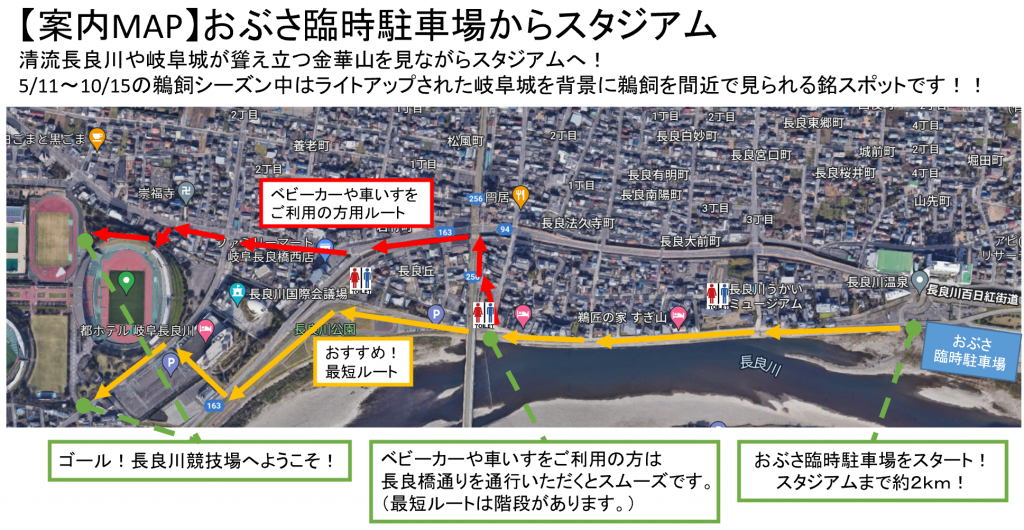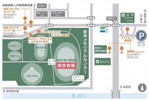※河川敷の臨時駐車場となっております。雨などによる増水で利用できない場合があります。状況次第では、当日急遽利用できない可能性がありますのでその際は、FC岐阜オフィシャルサイトにてご案内いたします。随時ご確認ください。