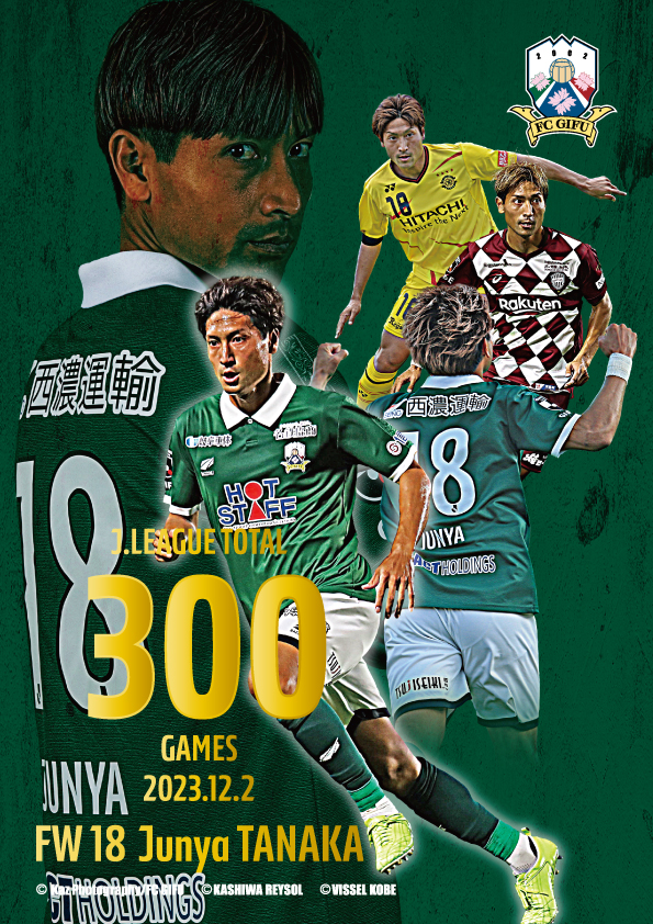 12月2日(土)に開催されました2023明治安田生命J3リーグ 第38節ギラヴァンツ北九州戦において、田中 順也選手がJリーグ通算300試合出場を達成いたしました。これを記念してグッズの受注販売が決定しましたので、お知らせします。