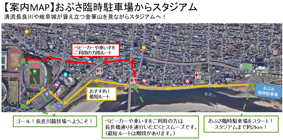 FC岐阜では、健康増進、維持のためホームゲーム開催会場である岐阜メモリアルセンター 長良川競技場への来場や長良川競技場周辺のウォーキングを推奨します。長良川競技場まで歩いて来場ができる方は歩いて、おぶさパーク臨時駐車場をご利用の方も、ぜひ長良川競技場周辺を歩いてみてください。