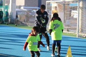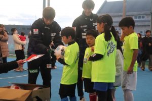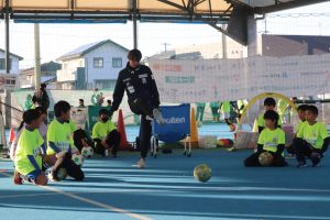 子どもたちは1年生~3年生と4年生~6年生の2グループ分かれ、ドリブルやシュートの練習を行いました。北選手と松本選手には子どもたちと一緒にプレーしたり、デモンストレーションを見せるなど、子どもたちのお手本となっていました。
