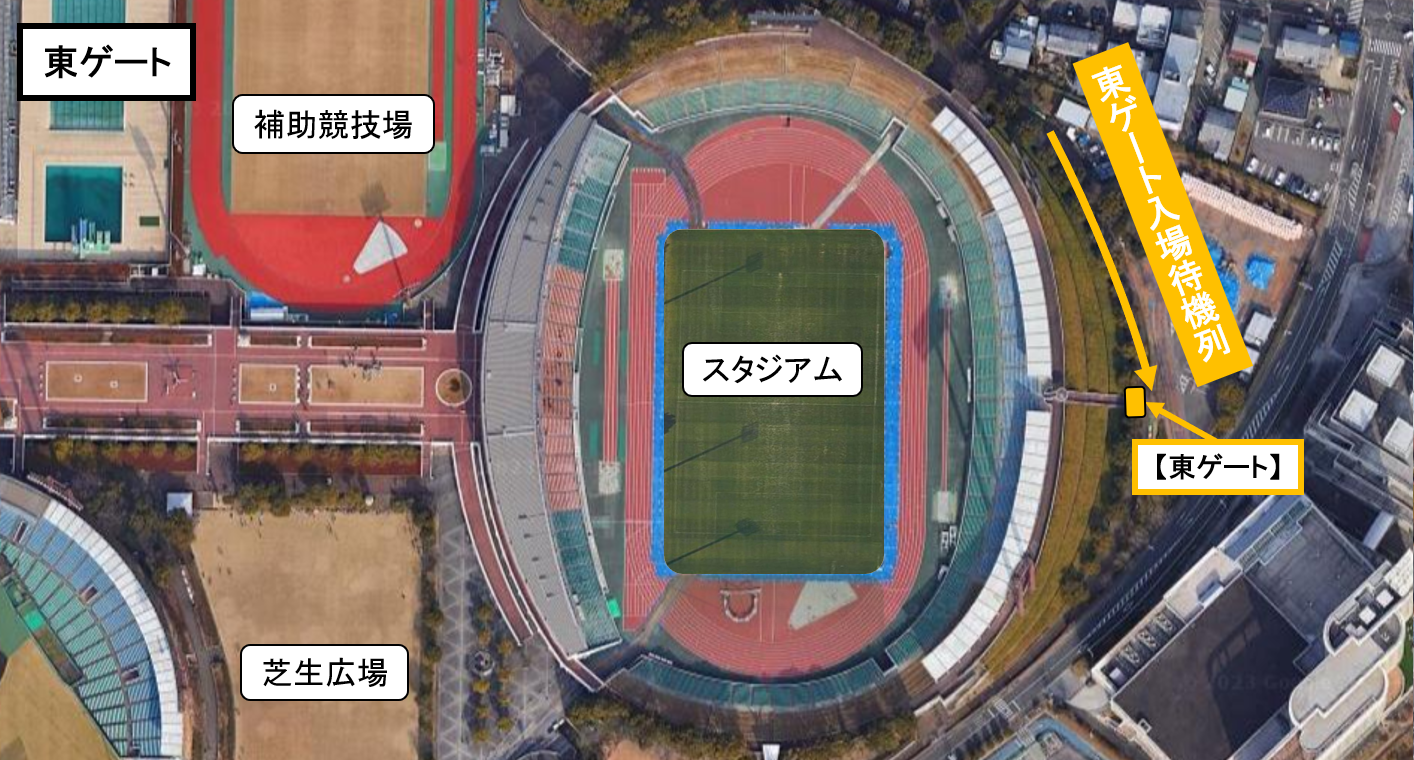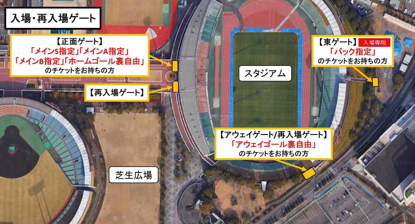 ※「バック指定」「アウェイゴール裏自由」のチケットをお持ちの方も正面入場ゲートから入場可能ですが、アウェイゲート列切れ後からとさせていただきます。