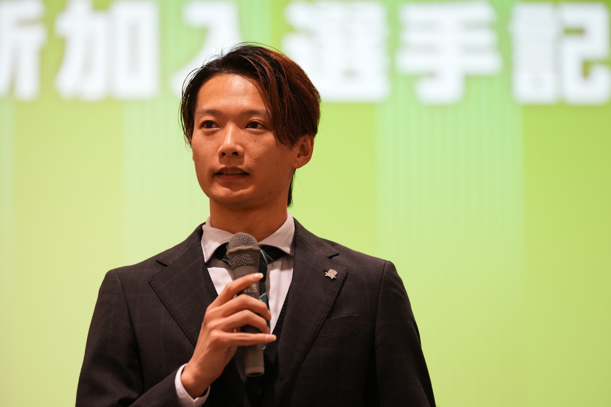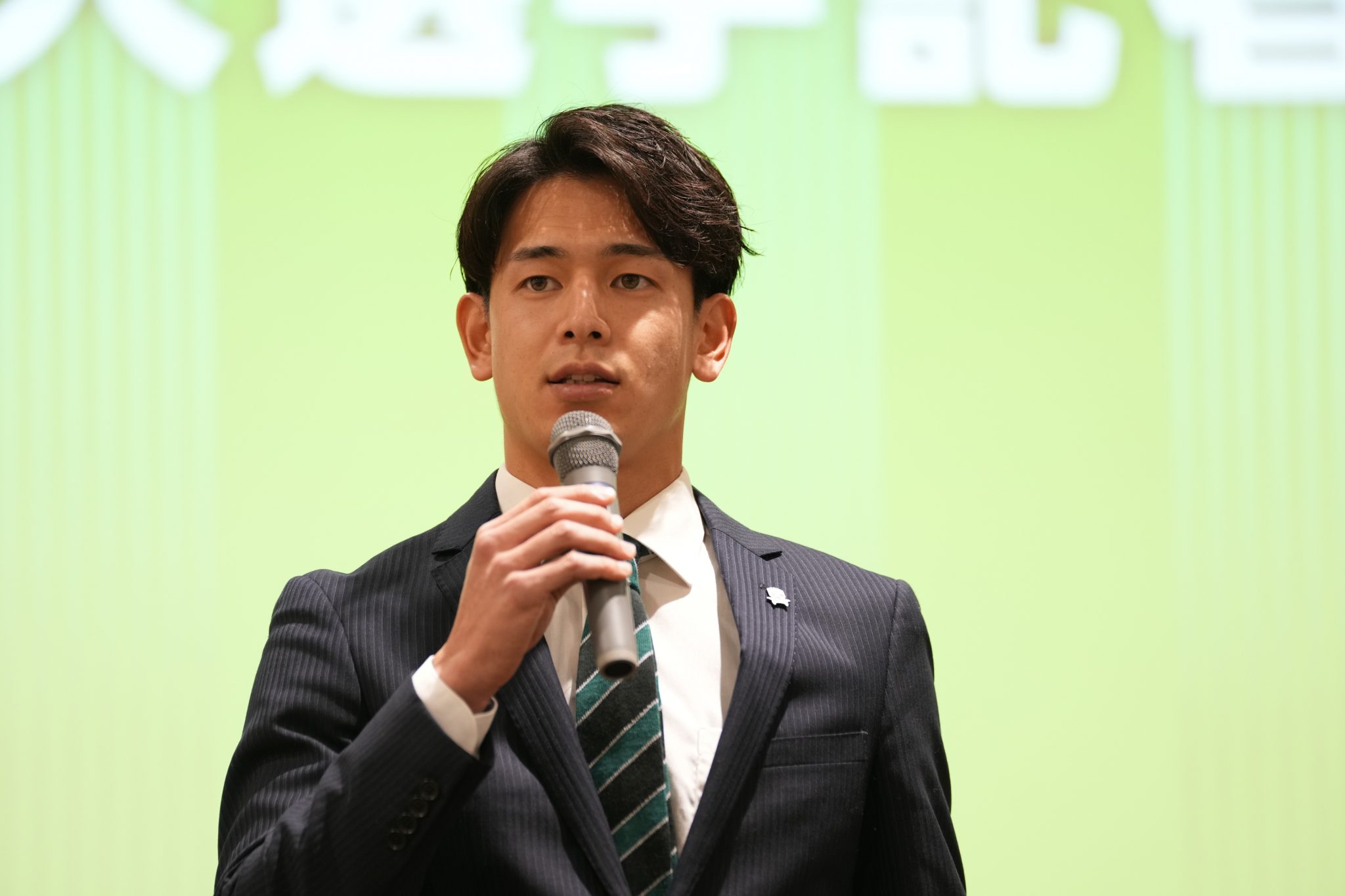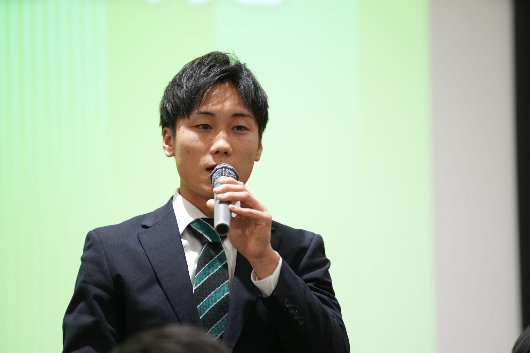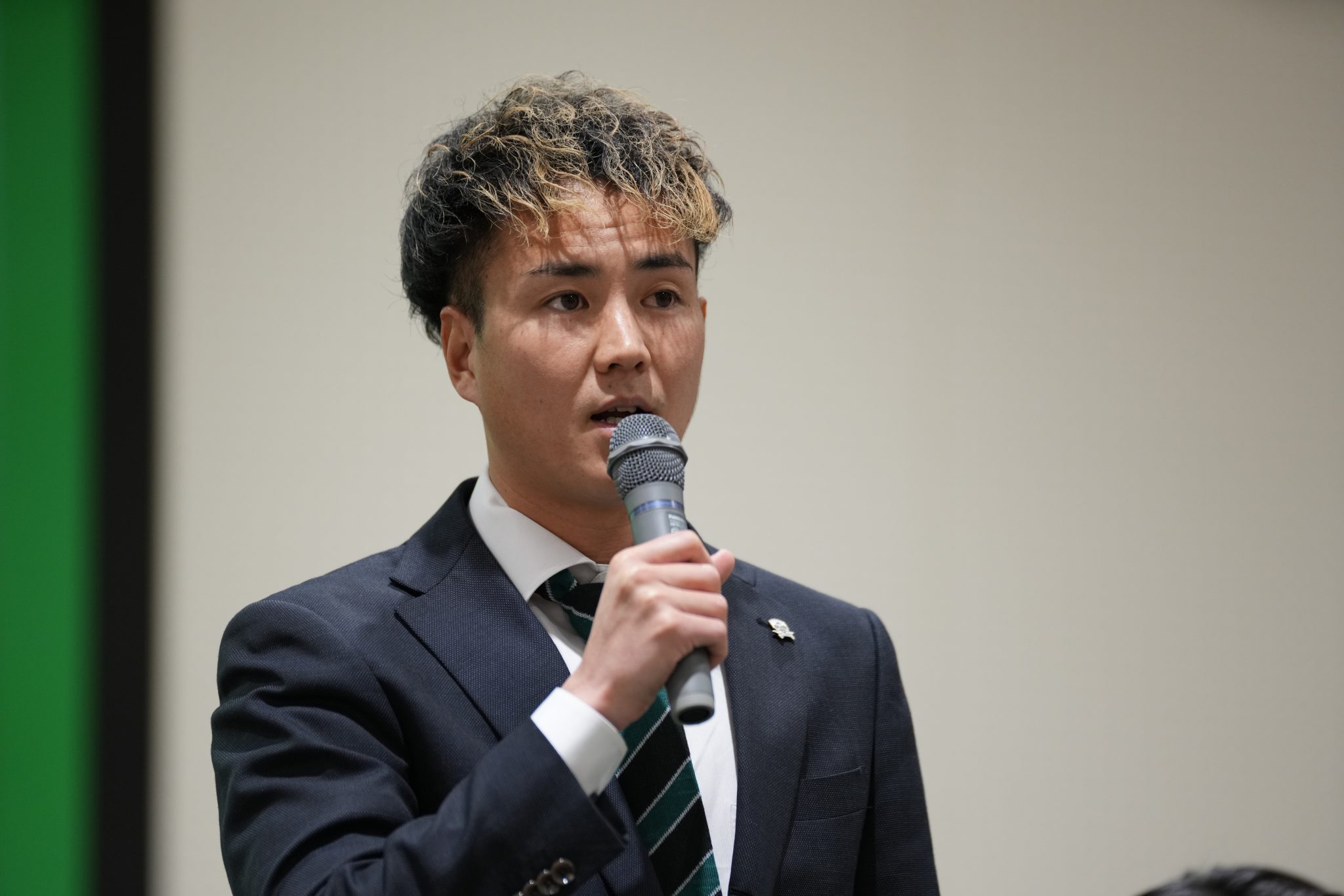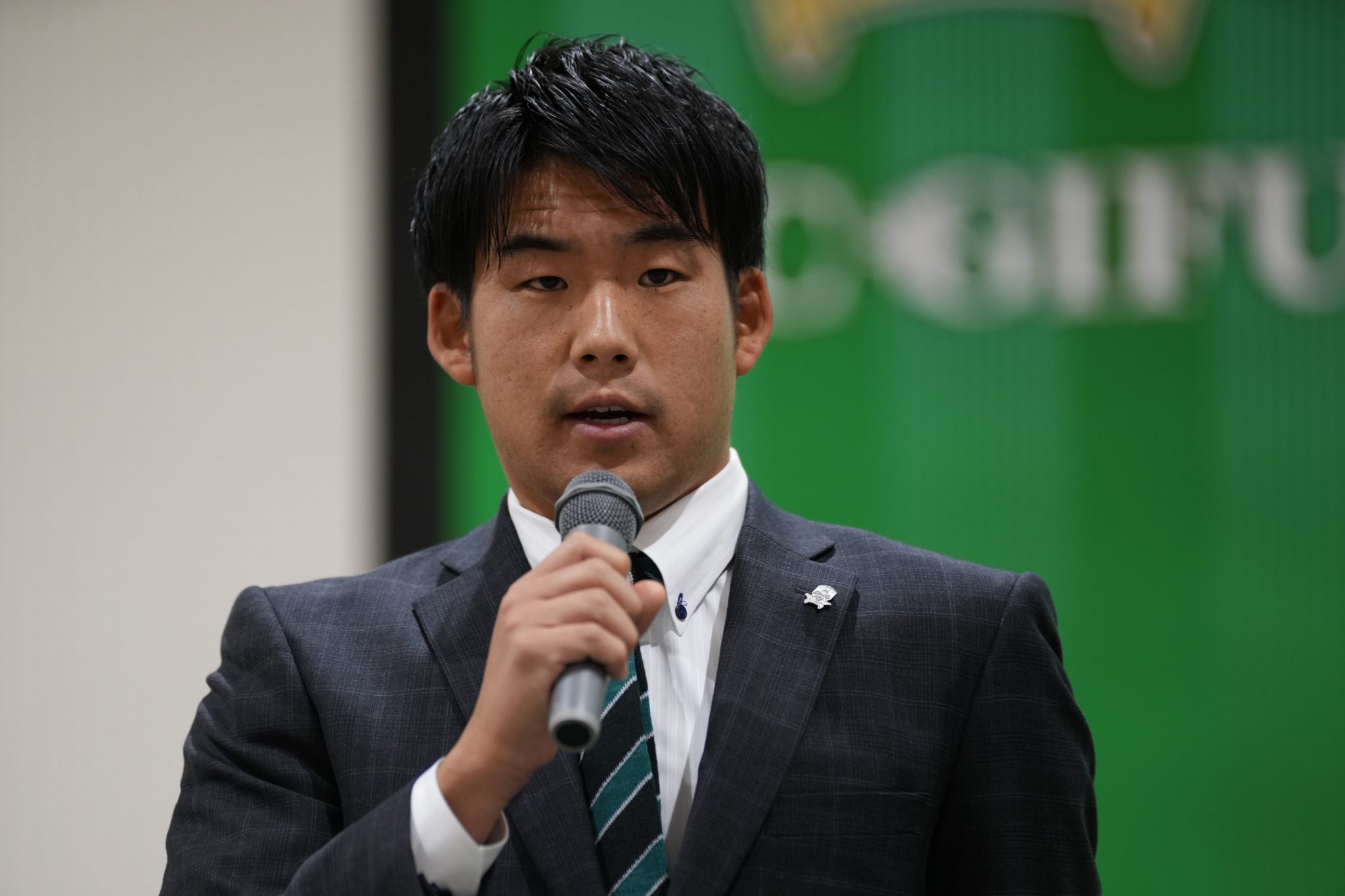 「はじめまして。サガン鳥栖から加入しました、河波櫻士です。今年の自分の目標は結果を残すことです。よろしくお願いします。」
