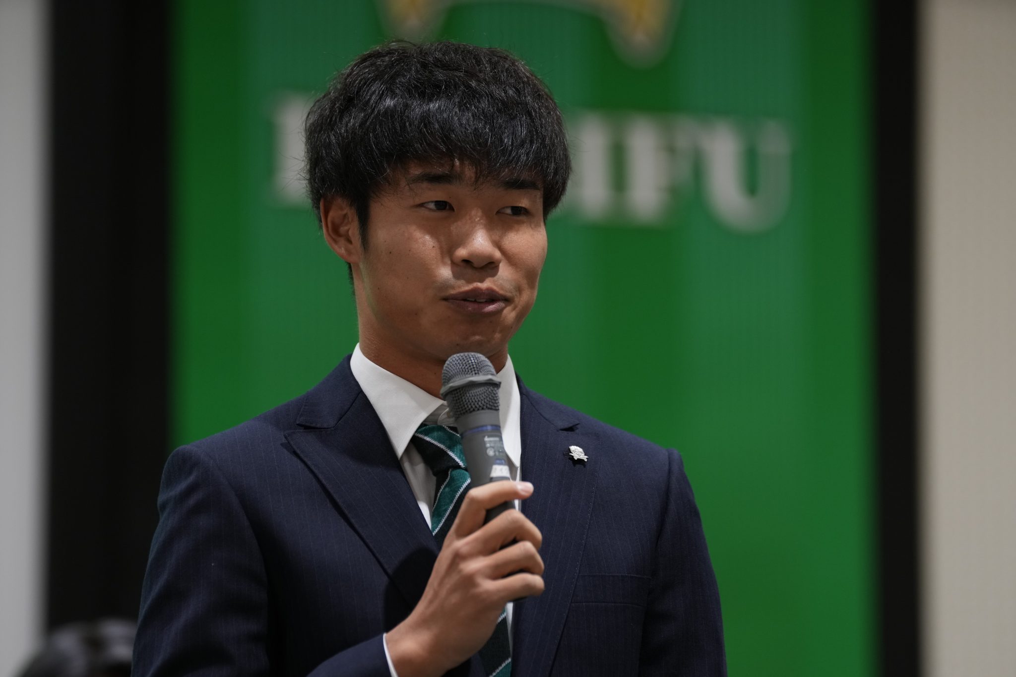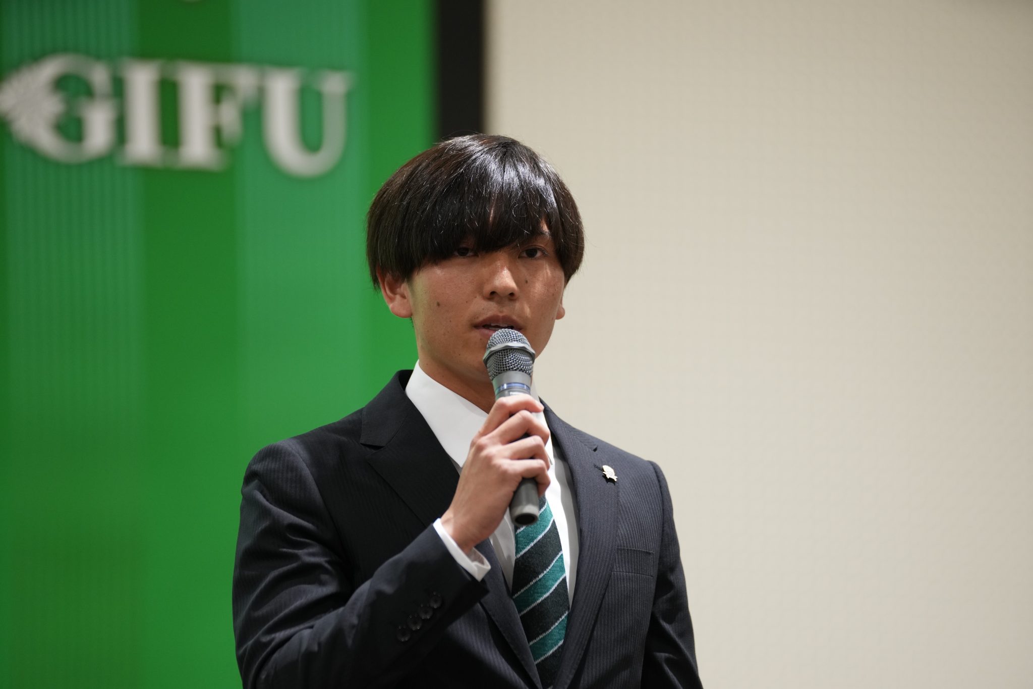 「皆さん初めまして。モンテディオ山形から加入しました新垣貴之です。ポジションはミッドフィルダーです。僕はFC岐阜はJ2にいるチームだと思っているので、昇格に向けて全力を出したいと思います。よろしくお願いします。」