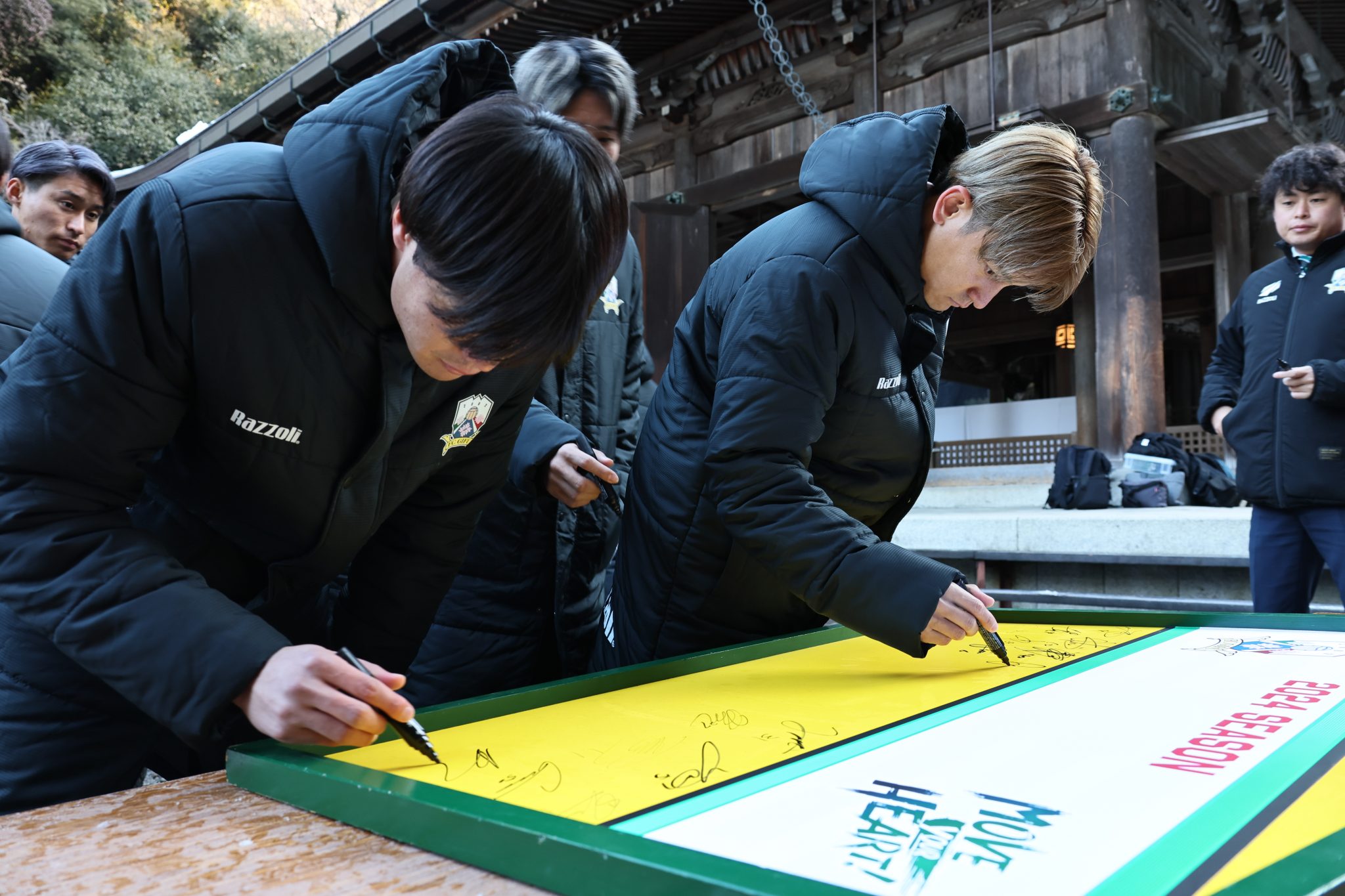 厳粛な神事に続き、今年も大きな絵馬に2024シーズンの活躍を誓い、全員がサインを書き込みました。