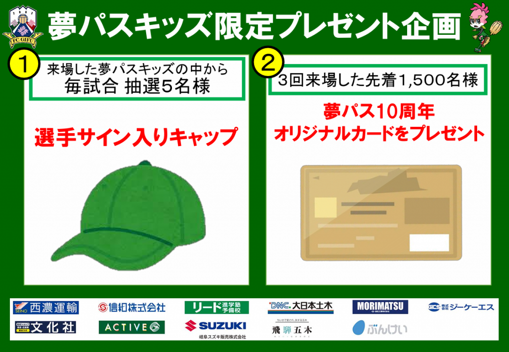 2024シーズン、FC岐阜ホームゲームにご来場いただいた夢パスキッズを対象に以下のプレゼント企画を実施しますので、お知らせいたします。