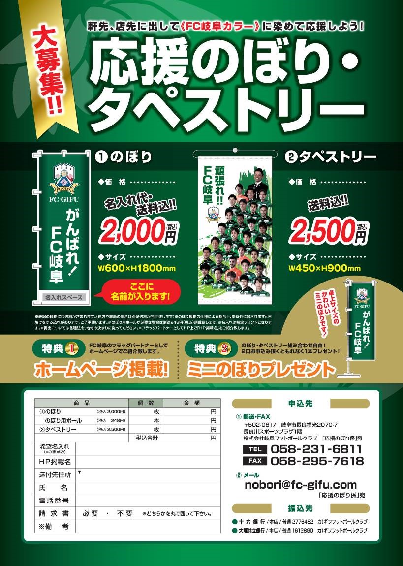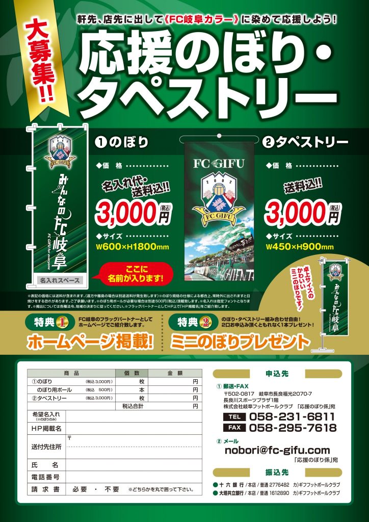 ①郵送・FAX 〒502‐0817 岐阜市長良福光2070-7 長良川スポーツプラザ1階 株式会社岐阜フットボールクラブ「応援のぼり・タペストリー係」宛 TEL:058‐231‐6811 FAX:058‐295‐7618 ②メール nobori@fc-gifu.com 「応援のぼり・タペストリー係」宛 |