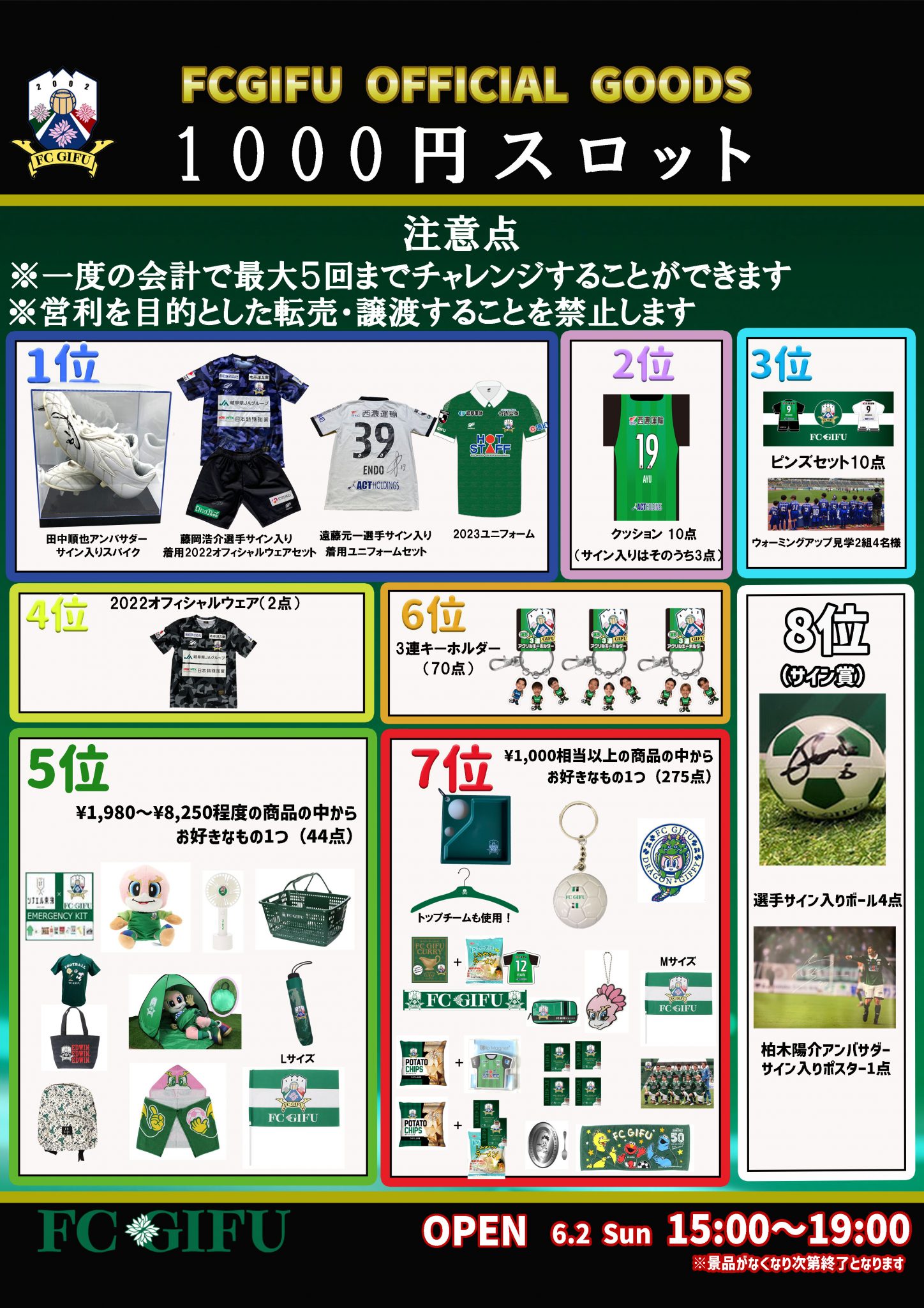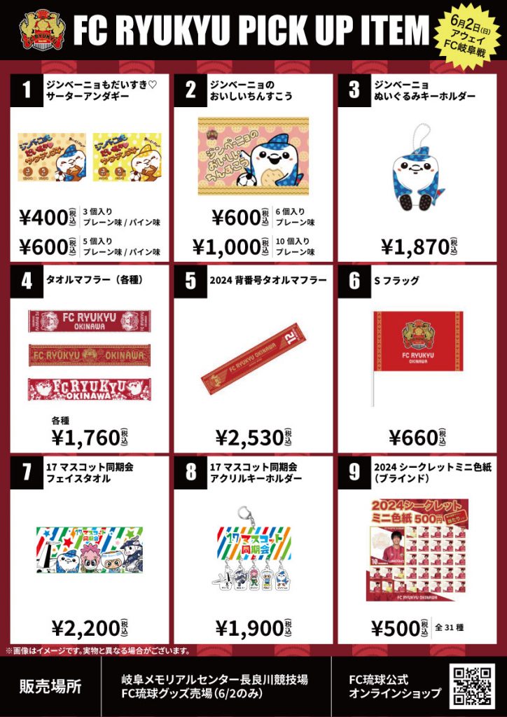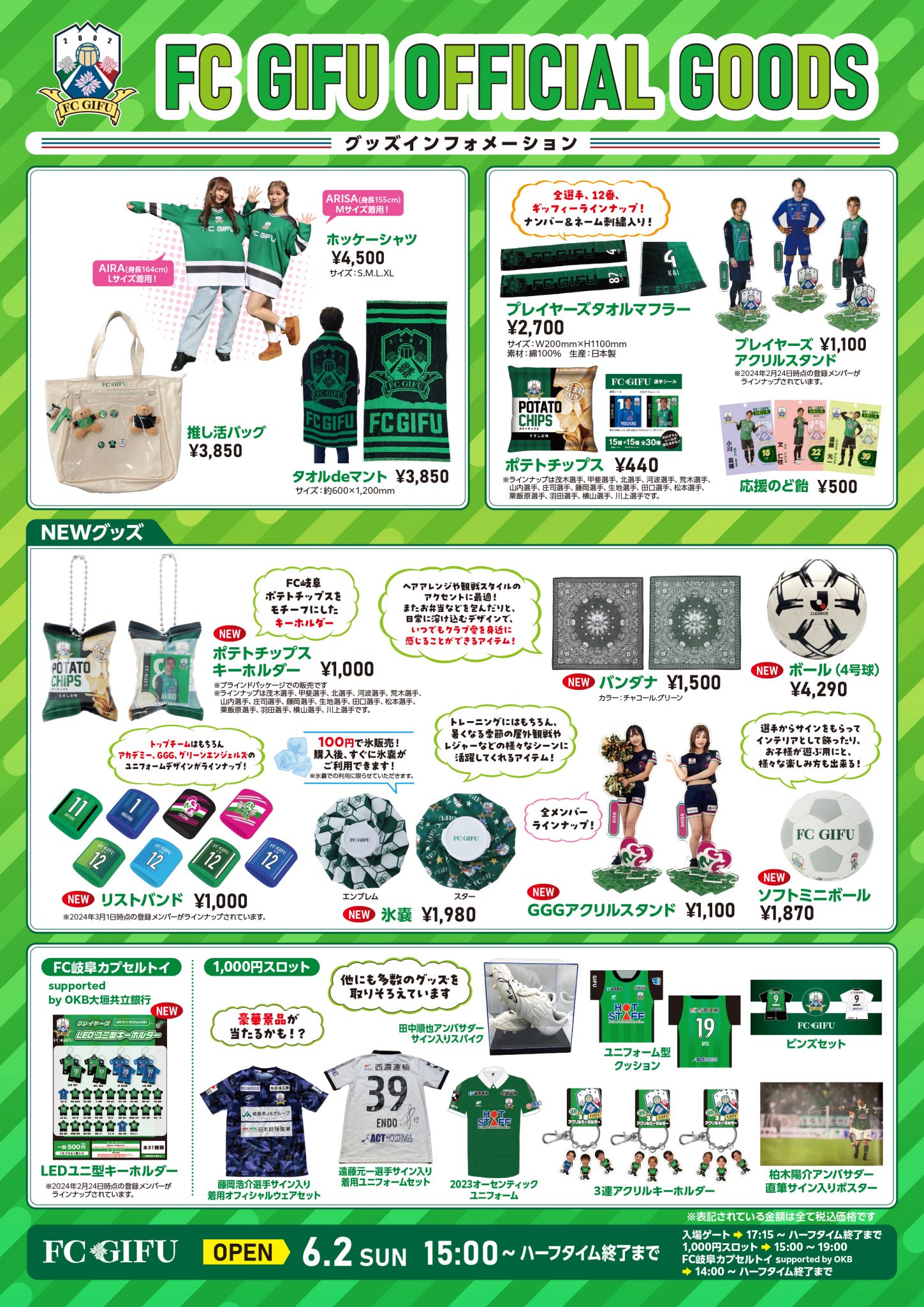 15:30 15:45 16:40 16:00 16:10 16:20 16:30 16:55 17:05 17:20 琉球BOMBERZタイム 17:30 FC岐阜選手トークショー 17:45 FC岐阜選手サイン会 長良川競技場場外軒下、入場ゲート FC岐阜スタジアムグッズ売店 16:00~ サンサンデッキ FC岐阜ファンクラブブース ◎来場者プレゼントは、入場ゲートでお配りする袋の中にランダムまたは先着で封入されています。 ー 応援うちわ ー ー <モンテール>熟成クラシック・フルーツ ー ー <モンテール>熟成クラシック・チョコレート ー ー チケットホルダー ー ー <金蝶堂>「7051(梨とシナモンのケーキ)・7481(梨とクリームチーズの羊羹)ー ー <川登屋>堂上蜂屋柿カンフェクトー ー 若尾製菓「市制70周年記念プリントクッキー」 ー ー 森本工房「美濃いびフランクフルト」ー ※インフォメーションブースに引換券をお持ちください。 ー キサラエフアールカンパニーズ「ぎふジビエ 鹿のまろやかカレー」ー ー 揖斐川町オリジナルグッズセット(エコバック/付箋/ハンカチ)ー ー 揖斐川町オリジナル付箋ー ー いび川温泉「藤橋の湯」入浴剤ー ー きのこしぐれ(しめじの佃煮) ー ー 佐合食品マスカットゼリー(おいしい八百津推奨品) ー ー 内堀醸造美濃特選だし酢(おいしい八百津推奨品) ー