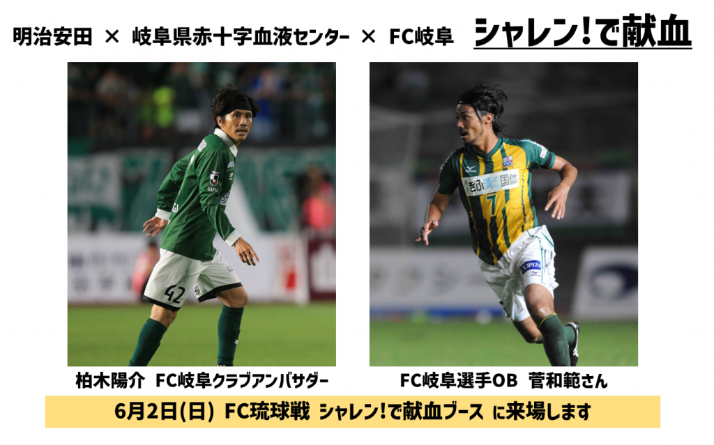 6月2日(日)FC琉球戦で開催する「シャレン!で献血」に柏木陽介FC岐阜クラブアンバサダーと、FC岐阜選手OBの菅和範さんが駆け付け、献血に協力いただいた皆さまへサインや写真撮影を実施します。