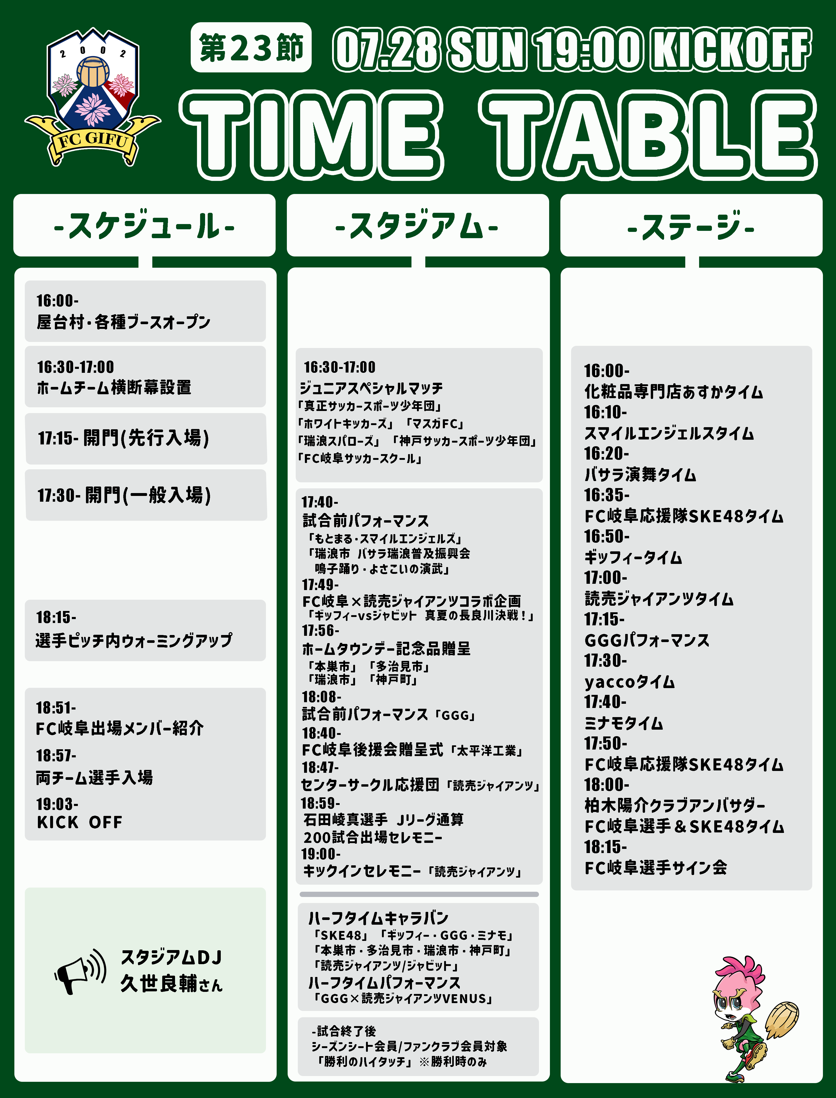 16:00 今年、化粧品専門店あすかがトップチームへ提供し、選手、コーチ、監督が使用中の『夏にピッタリのコスメ3品』を紹介します。 16:10 16:20 16:35 17:50 FC岐阜応援隊の『SKE48』から隊長の太田彩夏さん、副隊長の伊藤実希さん、山村さくらさん、相川暖花さんが来場し、かさなるステージを華やかに盛り上げます! 16:50 17:00 読売ジャイアンツのマスコットキャラクターであるジャビットやマスコットガールのヴィーナスが登場!9月開催の長良川球場での試合告知やジャンケン大会で会場を盛り上げます。 17:15 FC岐阜とエイベックスがコラボしたパフォーマンスチーム「トリプルジー」によるダンスをお楽しみ下さい。 17:30 yacco(ヤッコ)とLEOがFC岐阜かさなるステージを音楽の力で盛り上げます。 17:40 18:00 柏木陽介クラブアンバサダー,FC岐阜選手&SKE48タイム 18:15 FC岐阜選手サイン会 16:00~ サンサンデッキ 長良川競技場場外軒下 入場ゲート FC岐阜スタジアムグッズ売店 16:00~ サンサンデッキ FC岐阜ファンクラブブース ー クールタオル ー ー 美濃焼ミュージアム入場券 ー ー モザイクタイルミュージアム入場券 ー ー ばら菜キーホルダー ー ー 応援うちわ ー ー 応援クリアファイル ー