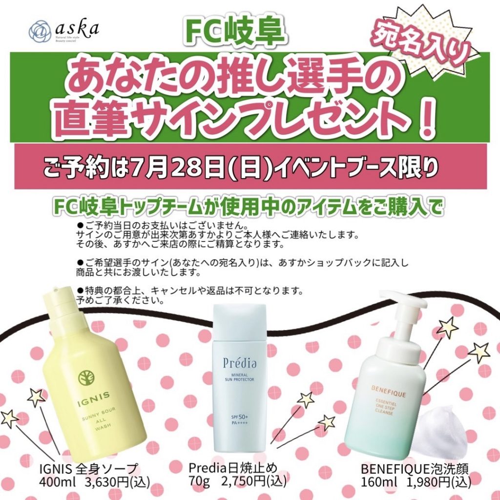 さらに!ご予約頂いた方の中から抽選で5名様に、FC岐阜ポスターにサインを入れてプレゼントいたします!ご予約特典は、7月28日日曜日のブースでのみになります。みなさん、スタジアムでお待ちしております!