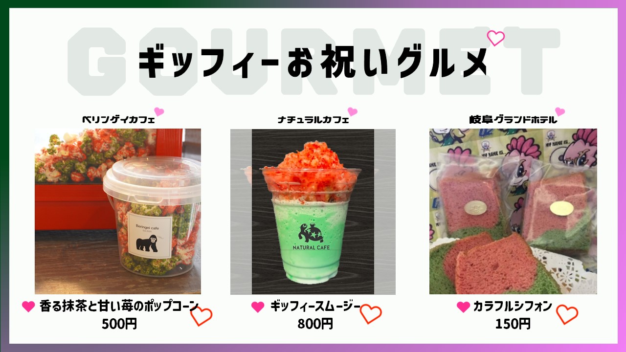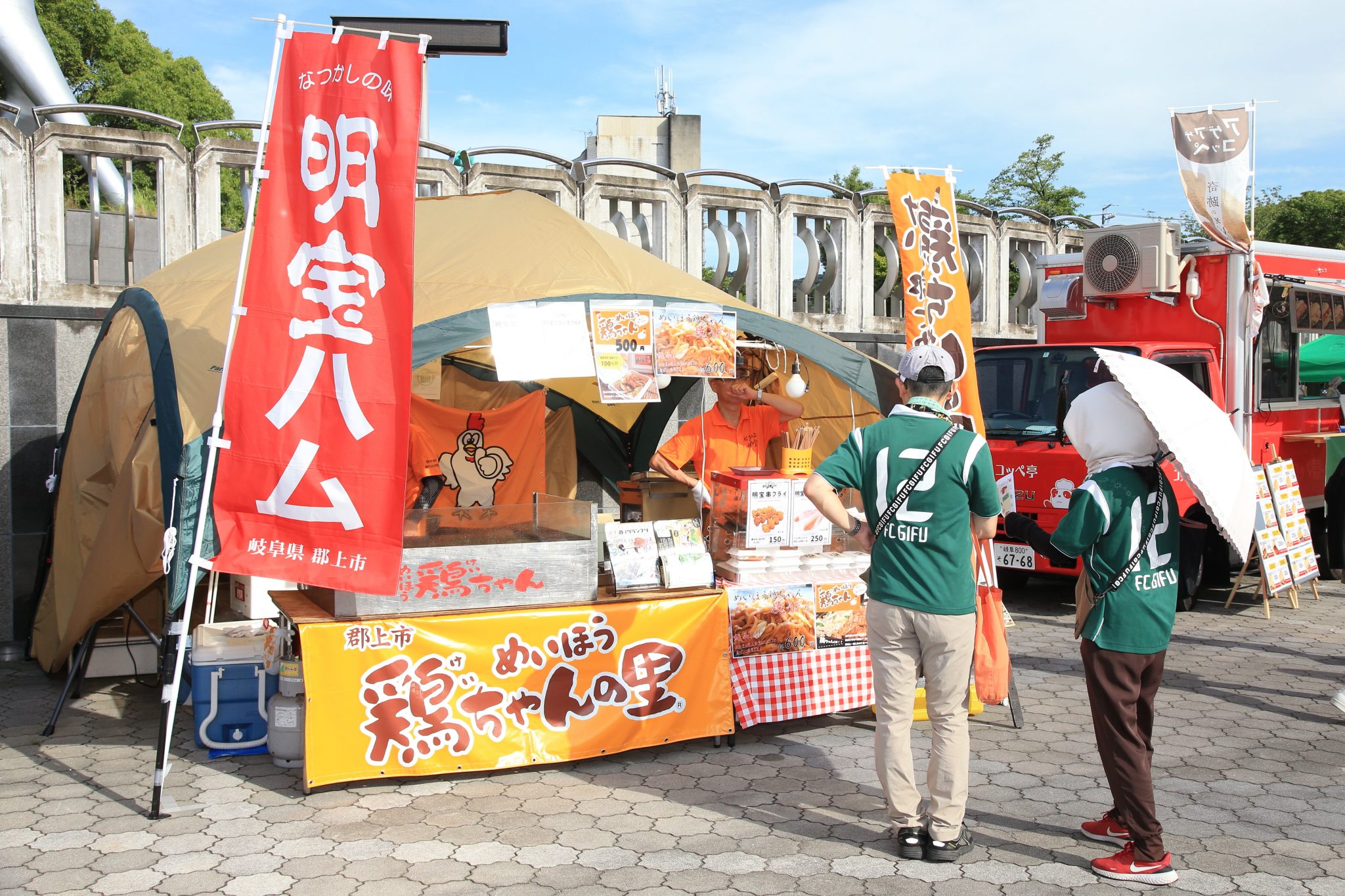 岐阜県JAグループブース 血管年齢測定や交通安全体験ゲーム、粗品プレゼントなどを実施します!ぜひお立ち寄りください。 郡上市グルメ・観光PRブース 郡上市から明宝けいちゃん研究会が出店し、明宝けいちゃん・明宝フランク・ハム串フライなど郡上グルメを販売します。 土岐市グルメ・観光PRブース 窯出しどら焼き、竹皮羊羹、葛バーなど土岐市グルメをぜひご賞味ください。 御嵩町グルメ・観光PRブース 元祖みたけとんちゃん焼、元祖みたけとんちゃん丼のグルメ出店、舳五山茶や才蔵手ぬぐいなどの販売など御嵩町の魅力が満載のブースです。 ほけんの窓口グループpresents「防災について学ぼう!FC岐阜サッカー教室」 起こりうる災害に備えるために、サッカーを通し楽しみながら防災についての知識を学びます。 明治安田 健活ブース フードドライブ FC岐阜×バローホールディングスwith岐阜県for子どもの居場所応援センター ご家庭で必要のなくなった食品をお持ちください!必要としている人のもとへ回収した食品をお届けすることで、食品ロスの削減に繋がります。