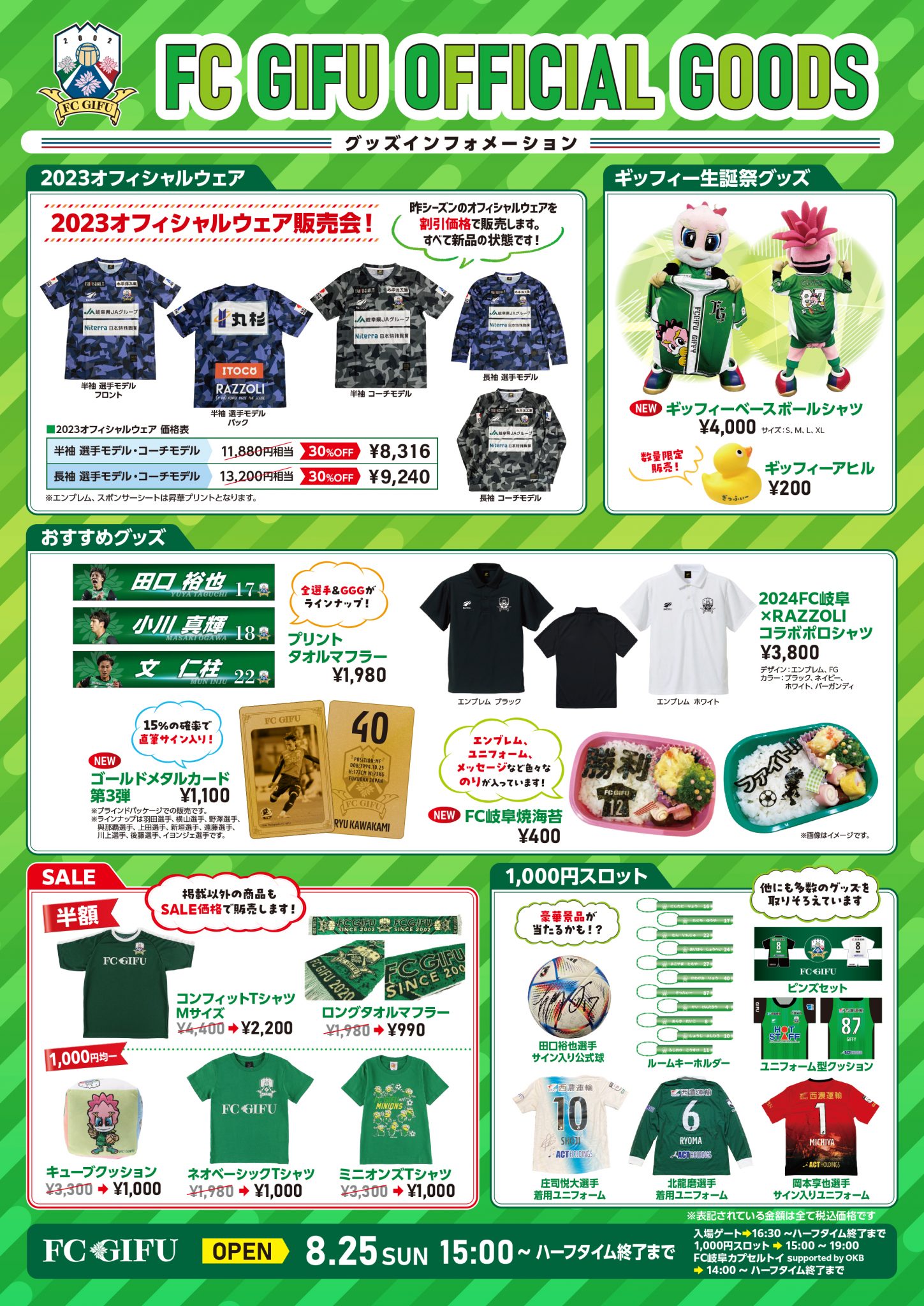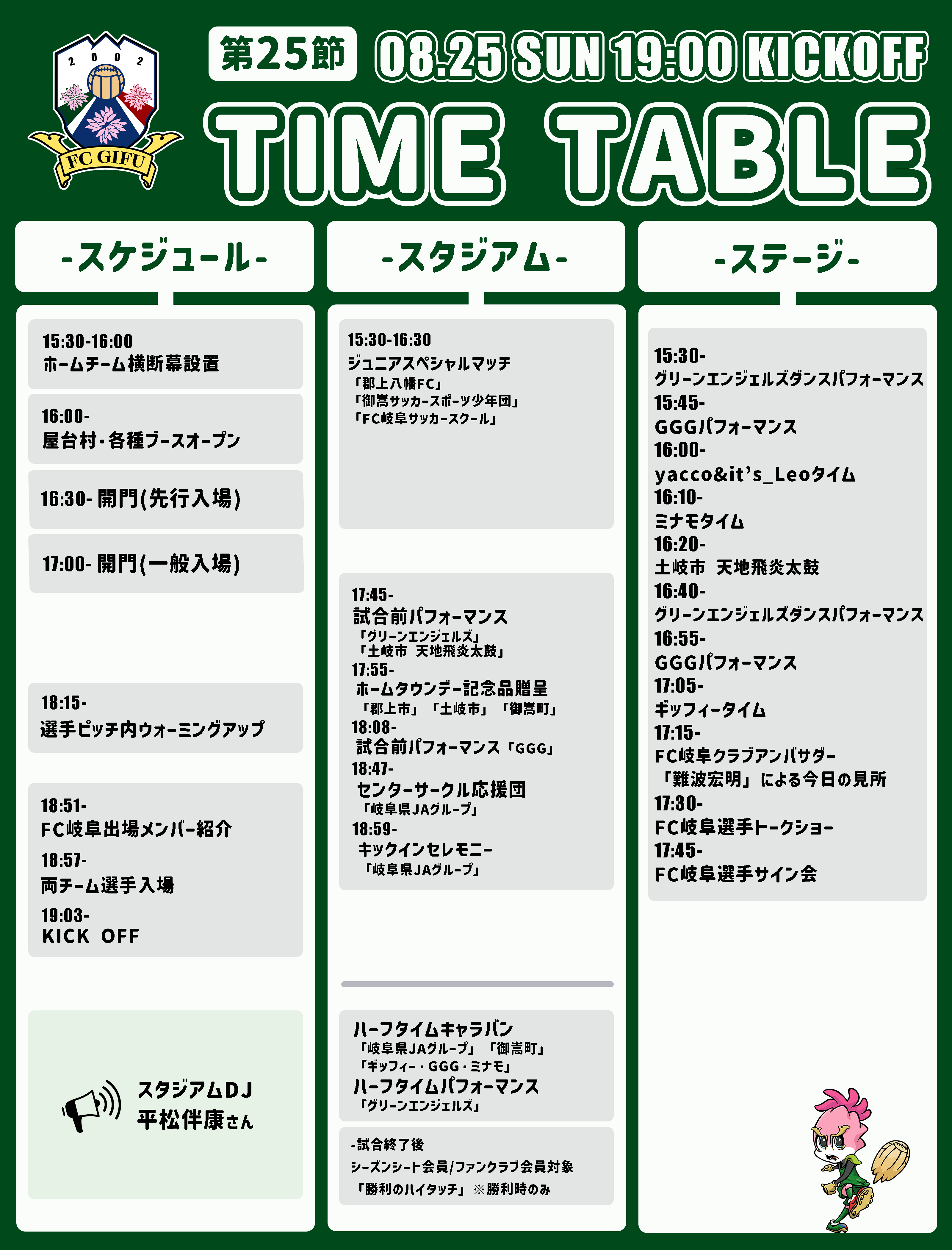 15:30 16:40 15:45 16:55 FC岐阜とエイベックスがコラボしたパフォーマンスチーム「トリプルジー」によるダンスをお楽しみ下さい。 16:00 yacco(ヤッコ)とLEOがFC岐阜かさなるステージを音楽の力で盛り上げます。 16:10 16:20 土岐市 天地飛炎太鼓 17:05 17:15 FC岐阜クラブアンバサダー「難波宏明」が本日の試合の注目点など見所をわかりやすく解説します! 17:30 FC岐阜選手トークショー FC岐阜選手によるトークショーです。 17:45 FC岐阜選手サイン会 16:00~ サンサンデッキ 長良川競技場場外軒下 入場ゲート FC岐阜スタジアムグッズ売店 16:00~ サンサンデッキ FC岐阜ファンクラブブース ー やまと温泉やすらぎ館入浴券 ー ー GJエイトマンステッカー ー ー 土岐商さいだー ー ※試合終了後のお渡しとなります。インフォメーションブースに引換券をお持ちください。 ー 豆皿 ー ※試合終了後のお渡しとなります。インフォメーションブースに引換券をお持ちください。 ー 飛騨春慶塗小物入れ ー ー ミーモくん ノート ー ー MIMO MEMO ー ー FC岐阜応援うちわ ー ー FC岐阜瞬間冷却パック ー