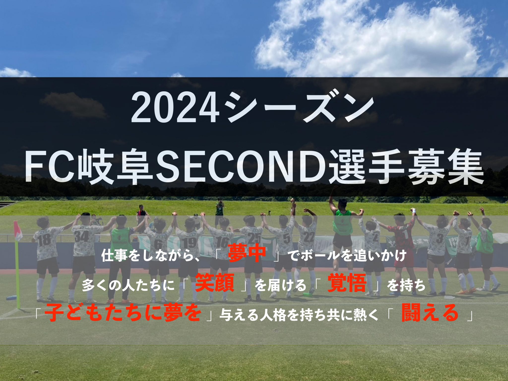 FC岐阜SECONEは、アマチュア選手として仕事をしながら、「夢中」でボールを追い、応援していただいてる皆さん、FC岐阜ファミリーに多くの「笑顔」を届ける努力と行動を起こせるという「覚悟」を持ち、FC岐阜の理念でもある「子どもたちに夢を」与えれる人格(人間性)を持ち、共に熱く「闘える」選手を募集します。