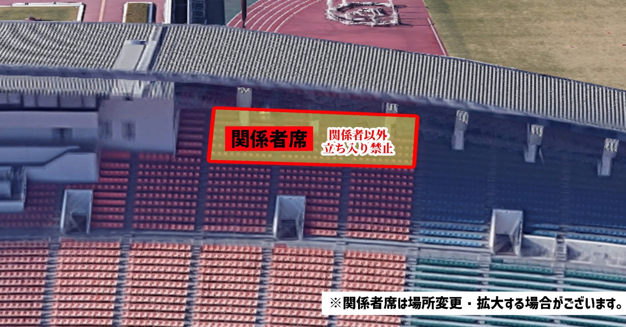 当該試合は運営・観戦ルール等に一部変更があります。 河川敷への駐車になりますので、警備員の指示に従って、安全な運用にご協力ください。 メイン自由席の一部に「関係者席」を設置いたします。対象エリア内は一般のお客様はご着席いただけません。運営・観戦ルールの変更について