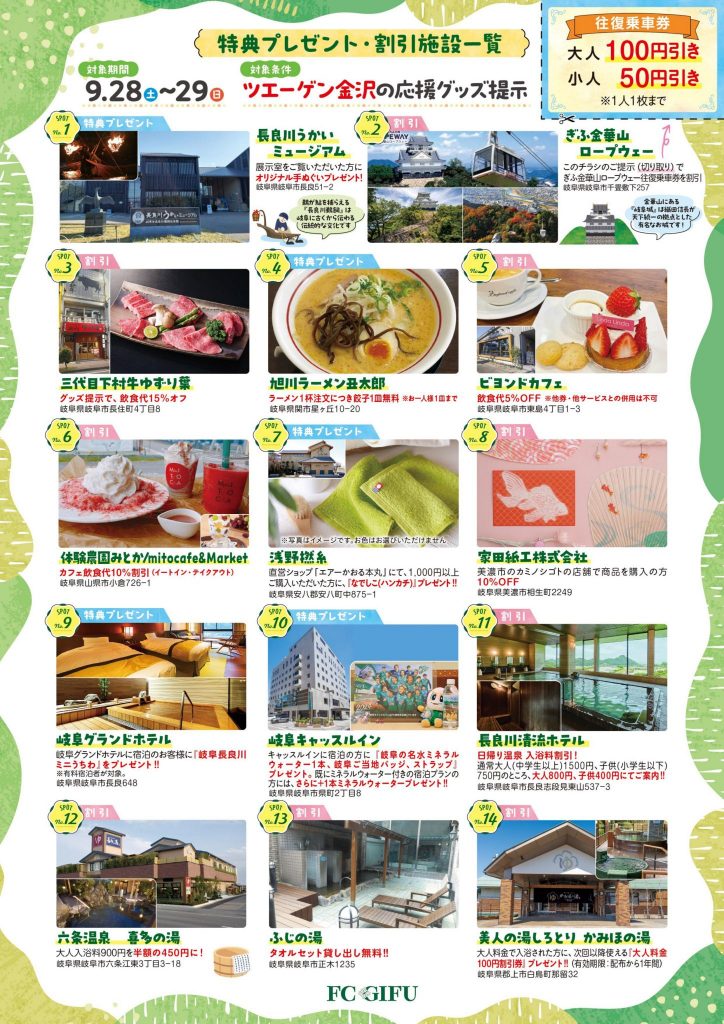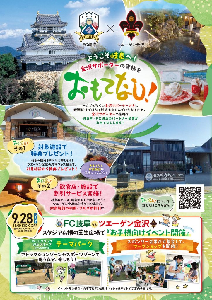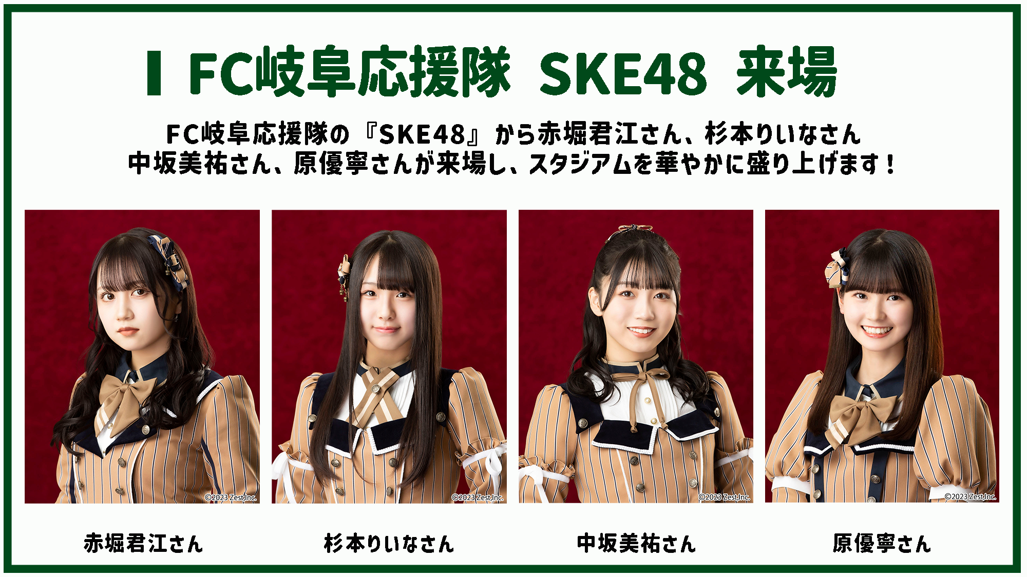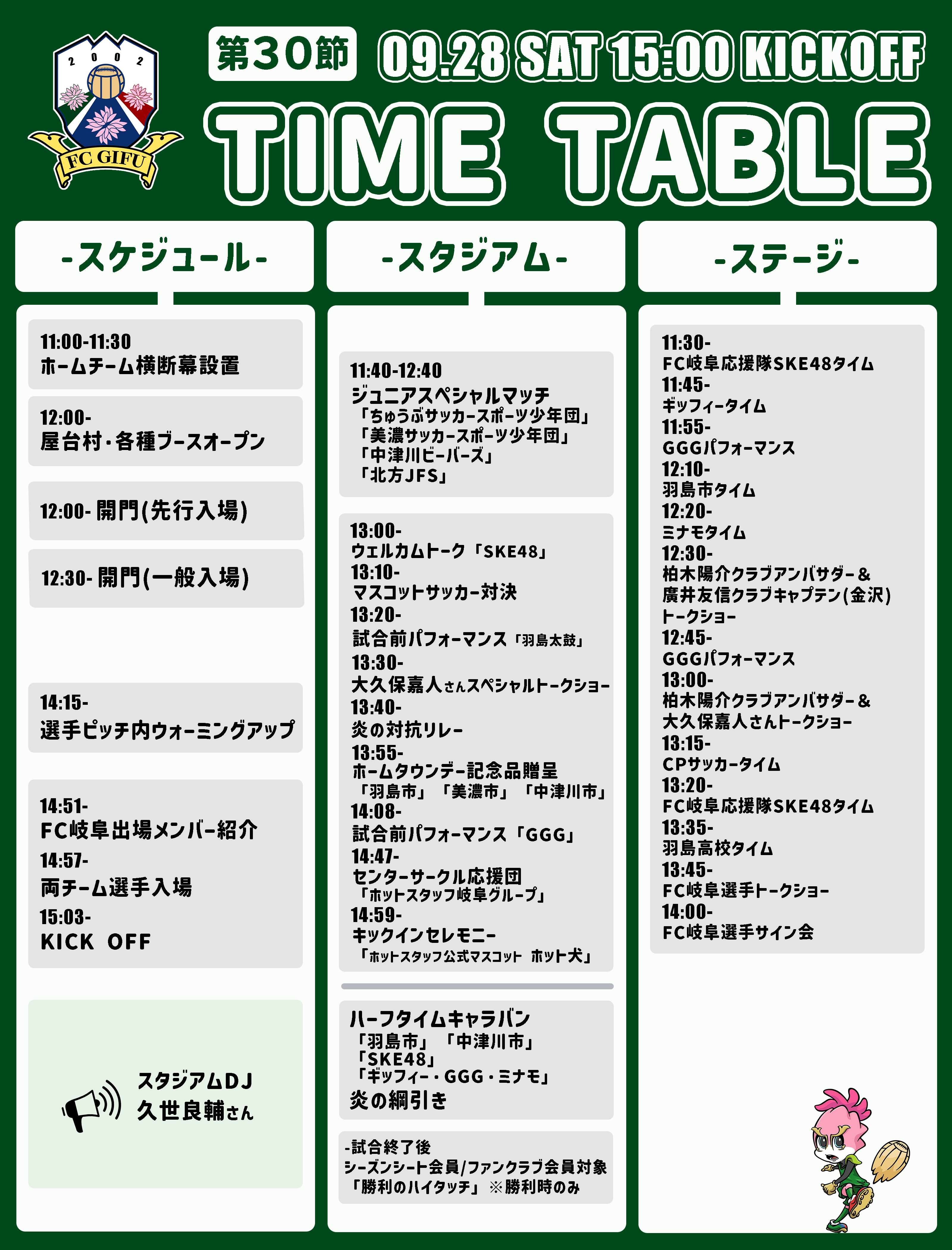 美濃市グルメ・観光PRブース 伊作さんの鮎飯(瓢麓苑)や、 さつまいもぼーる、うだつ上がるコーラドリンク、コーラを使った唐揚げ・ピザ、クラフトビールなど、美濃市グルメが盛り沢山!ぜひご賞味ください。 第2弾!GGG考案コッペパン ※実際の商品とイメージが異なる場合があります ホンダカーズ岐阜 応援ブース CIVIC RS 、FIT RSの展示、お楽しみイベントとして輪投げゲームを開催します! 長谷虎紡績羽毛製品・古着回収ブース スタジアムにて羽毛製品回収を行います。使用していない羽毛製品をお持ちより下さい!羽毛製品をお持ちいただいた方には、FC岐阜選手のサイン色紙と交換させていただきます。(選手はランダムです。 先着の為、サイン色紙がなくなる場合がございますがご了承ください。)※ダウン割合が50%未満の物は回収できません。製品についている品質表示タグをご確認ください。 また当日は古着回収も行います。不要になった古着も是非お持ちより下さい! ※回収できないもの:破れたもの、汚れのひどいもの、靴下、下着類、ネクタイ、マフラー、帽子、手袋、革小物、靴、ベルト、被服雑貨、ぬいぐるみ、カバン ※透明または、半透明のビニール袋にいれてお持ちより下さい。 長谷虎グループではSDGs活動の一環として羽毛の回収、リサイクルを行っております。ダウンジャケットや羽毛布団など羽毛製品を回収し、羽毛を最新の技術で洗浄し、再度羽毛を使用できる状態にすることで、環境配慮に繋がります。 羽島高校ブース 兎月園とコラボした「イタセンパラ」をモチーフにしたお菓子「ねぇ~知ってる?ITASENPARA(板鮮腹)」や、コッペ亭とコラボした新商品の販売をおこないます。 大日コンサルタントpresents「防災について学ぼう!FC岐阜サッカー教室」 ≫詳細はコチラ マスコットサッカー対決 文溪堂ブース クリアポーチ せんぼんびき企画!! 当たりは「トップ選手の直筆メッセージカード」が入っています 聞いてみたいメッセージやイラスト、何が出るかお楽しみ!! 明治安田 健活ブース フードドライブ FC岐阜×バローホールディングスwith岐阜県for子どもの居場所応援センター ご家庭で必要のなくなった食品をお持ちください!必要としている人のもとへ回収した食品をお届けすることで、食品ロスの削減に繋がります。 白山ダービー「おもてなし企画」 ようこそ岐阜へ!ツエーゲン金沢ファン・サポーター様『おもてなし企画』!! 金沢サポーター様限定の割引・特典プレゼント企画を開催します。 ≫詳細はこちら ツエーゲン金沢 グッズ販売 ツエーゲン金沢のグッズ販売ブースが出張出店します! CCNかさなるステージがパワーアップ!! 11:30 13:20 FC岐阜タイム応援隊 SKE48タイム FC岐阜応援隊の『SKE48』から赤堀君江さん、杉本りいなさん、中坂美祐さん、原優寧さんが来場し、かさなるステージを華やかに盛り上げます! 11:45 ギッフィータイム FC岐阜マスコット「ギッフィー」によるダンスパフォーマンスです! 11:55 12:45 GGGパフォーマンス FC岐阜とエイベックスがコラボしたパフォーマンスチーム「トリプルジー」によるパフォーマンスをお楽しみ下さい。 12:10 羽島市タイム 「ひつじサミット尾州」「ぎふ羽島駅前フェス」など羽島市の情報をお伝えします。 12:20 12:30 FC岐阜 柏木陽介クラブアンバサダーとツエーゲン金沢 廣井友信クラブキャプテンが金沢と岐阜のいいところプレゼン対決に挑戦!!その他にも見所トーク満載!ぜひ、ご観覧ください! 13:00 柏木陽介クラブアンバサダー&ホットスタッフ岐阜グループ Presents スペシャルゲストの大久保嘉人さんのスペシャル トークショーを開催します! 13:15 CPサッカータイム CPサッカーの魅力をお伝えします。 13:35 羽島高校タイム 木曽川に生息する絶滅危惧種で天然記念物の魚「イタセンパラ」についてと、当日販売する「なまずフライコッペ」、「 ねぇ~知ってる?ITASENPARA」の商品をPRします。 13:45 FC岐阜選手によるトークショーです。 14:00 FC岐阜選手によるサイン会を開催します。 12:00~ サンサンデッキ 長良川競技場場外軒下、入場ゲート FC岐阜スタジアムグッズ売店 12:00~ サンサンデッキ FC岐阜ファンクラブブース ー レジャーシート ー