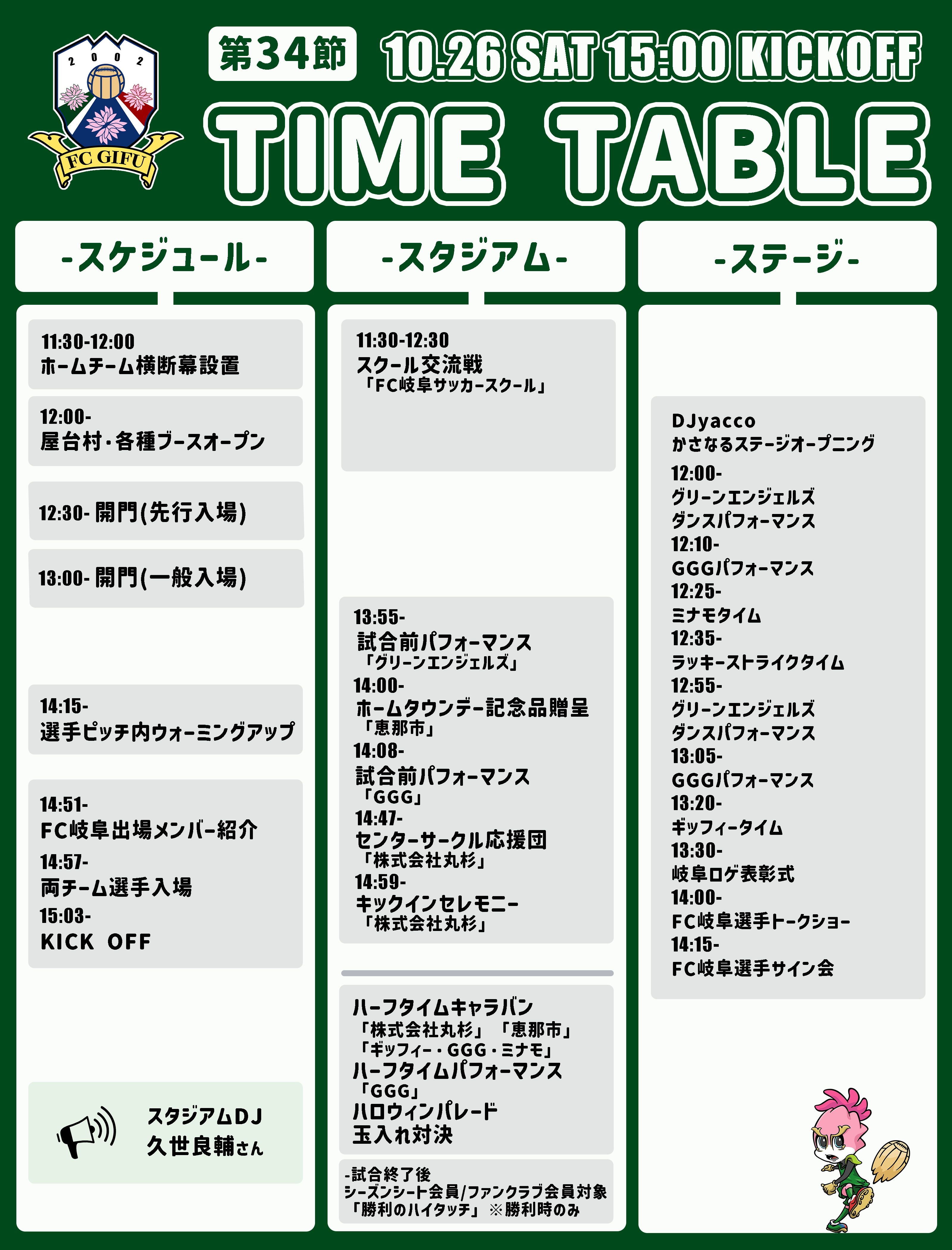 | その他 | 【集合場所】長良川競技場第1ゲート(南側スロープ下付近) 【集合時間】15:40 ※ハーフタイムになり次第出発する関係で、前半終了前に集合時間を設定しています。参加をご希望の場合は、集合時間にご注意ください。 |