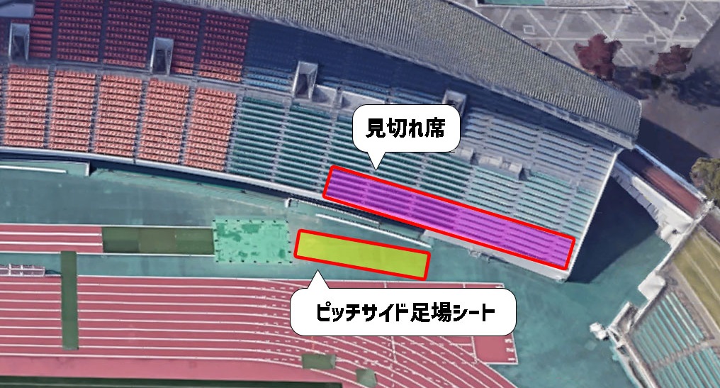 「信和株式会社 presents ピッチサイド足場シート」の設置に伴い、メイン自由席にピッチの一部が隠れる「見切れ席」が発生いたします。★お知らせ★