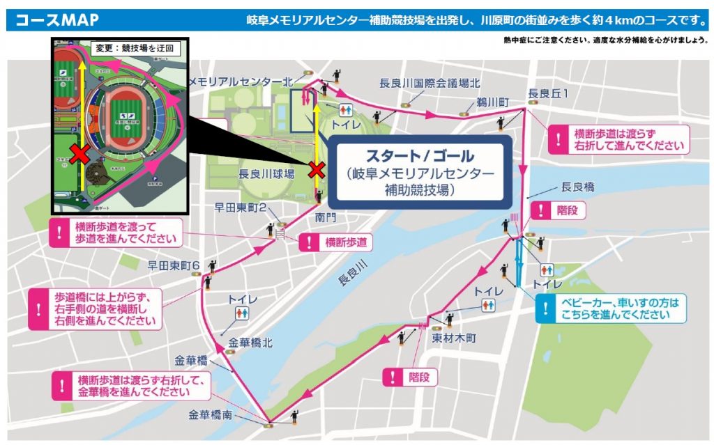 岐阜メモリアルセンター補助競技場を出発し、川原町の街並みを歩く約4kmのコースです。