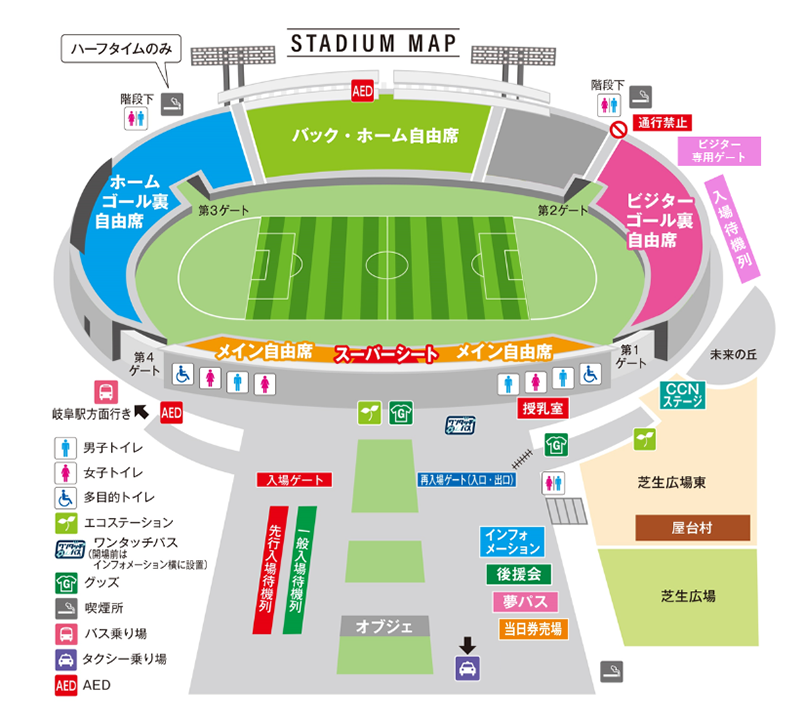 当日の駐車場状況については、FC岐阜オフィシャルサイト又はFC岐阜公式X(旧Twitter)にて最新情報をお知らせいたしますのでご確認ください。