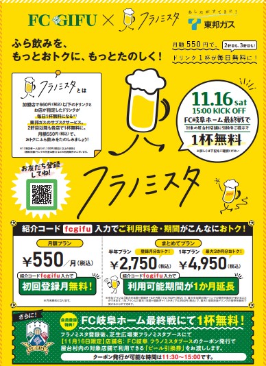 11月16日(土)明治安田J3リーグ第37節大宮アルディージャ戦の1DAYイベントとして、FC岐阜のオフィシャルパートナーである東邦ガス株式会社様と共同で東邦ガス様が運営するサブスクリプション(定額利用)サービス「フラノミスタ」の普及イベントを開催します。紹介コード入力しご登録いただくことで、FC岐阜の支援になります。