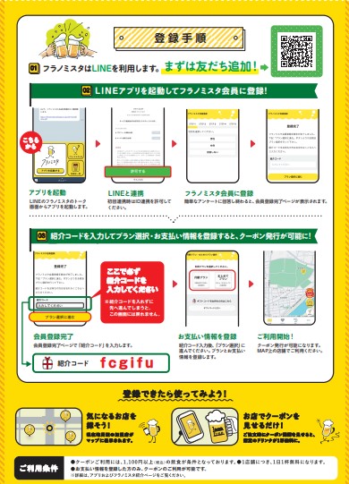 さらに、ご登録時に紹介コード『fcgifu』を入力いただくと初回登録月無料または利用可能期限が1か月延長される特典がついています!紹介コードを入力してフラノミスタにご登録いただくと、FC岐阜の支援にもつながりますので、ぜひご活用ください。
