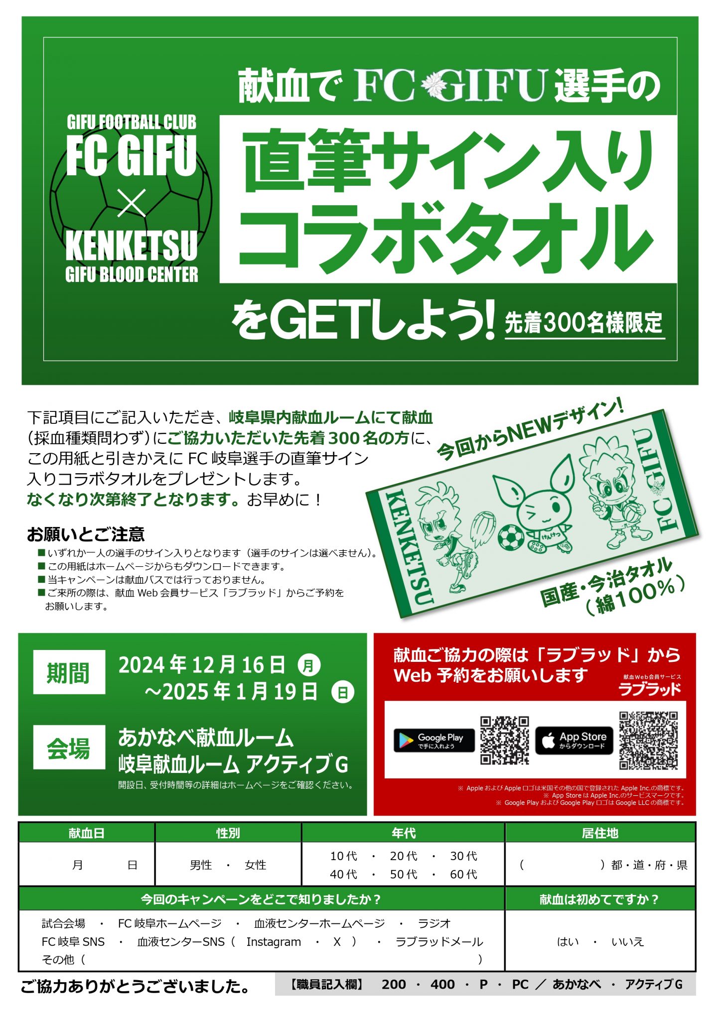 下記会場にて献血(採血種類を問わず)にご協力いただいた先着300名の方に「申込用紙」と引きかえでFC岐阜選手の直筆サイン入り『けんけつちゃん×ギッフィー コラボタオル』をプレゼントいたします。
