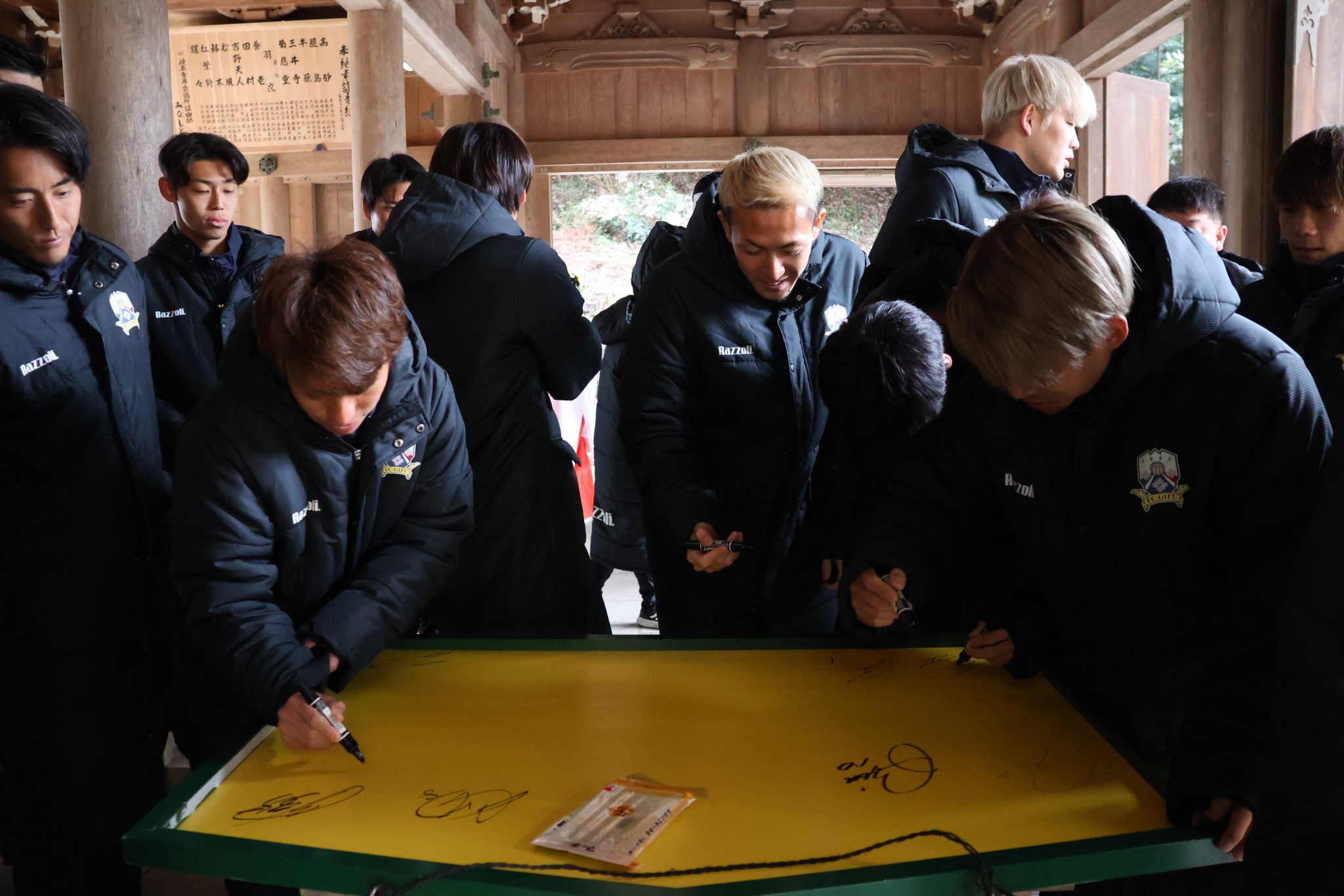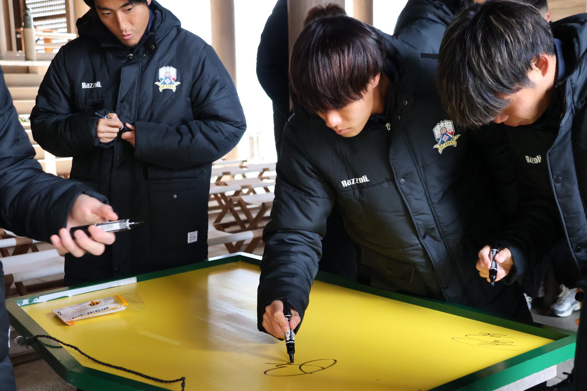 厳粛な神事に続き、今年も大きな絵馬に2025シーズンの活躍を誓い、サインを書き込みました。