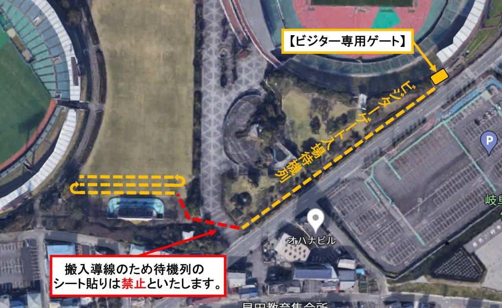 ※ビジターチームを応援する「スーパーシート」「メイン自由席」チケットをお持ちのお客様は、通常通り「正面入場ゲート」より入退場、および再入退場をお願いいたします。