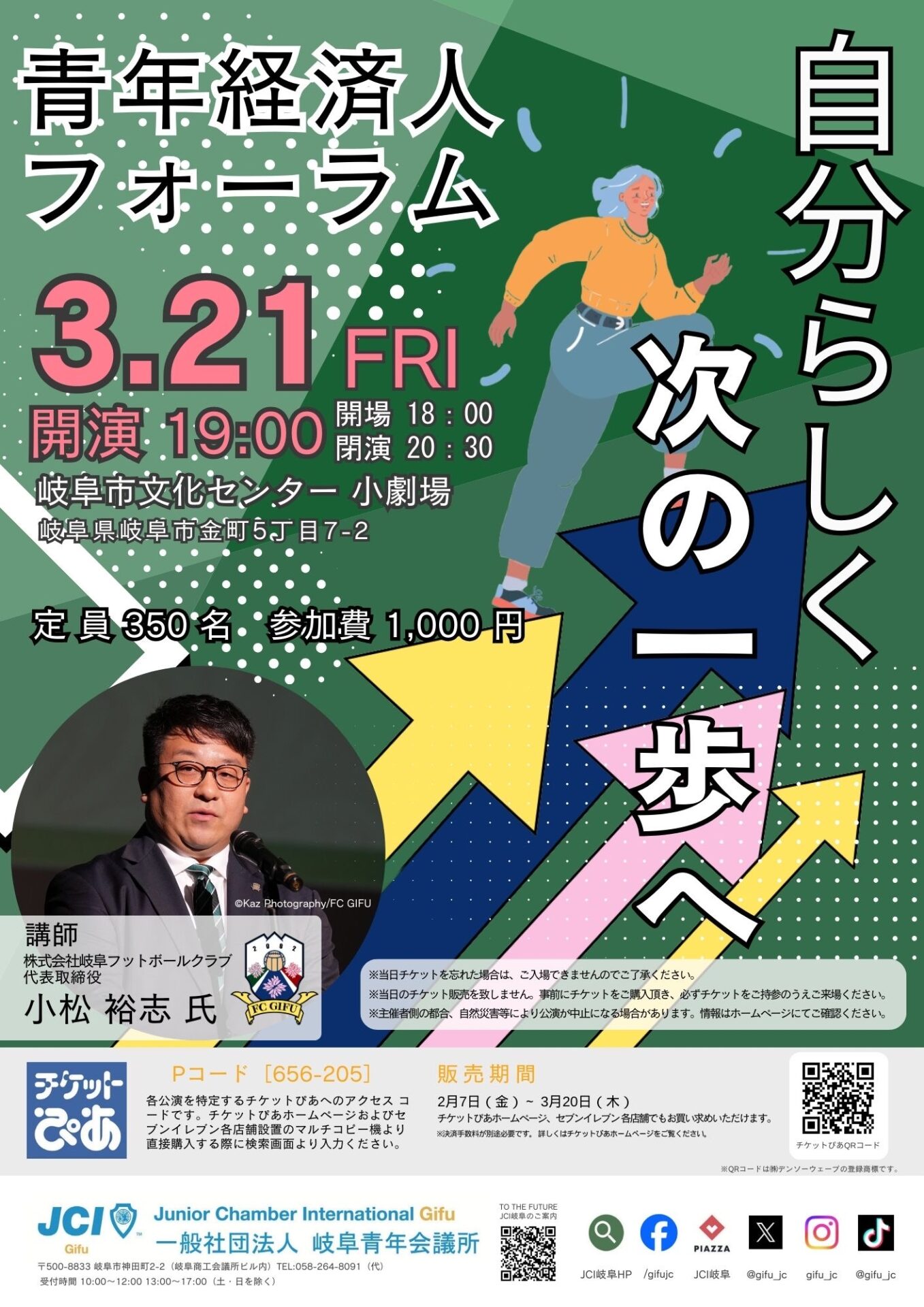一般社団法人 岐阜青年会議所主催の3月公開例会 青年経済人フォーラムにて、FC岐阜の小松裕志 代表取締役社長が、「自分らしく次の一歩へ」と題し、講師を務めます。