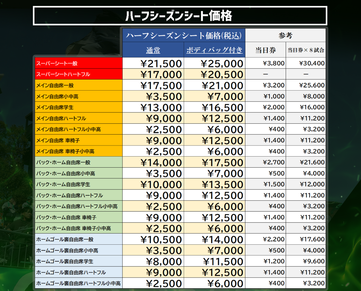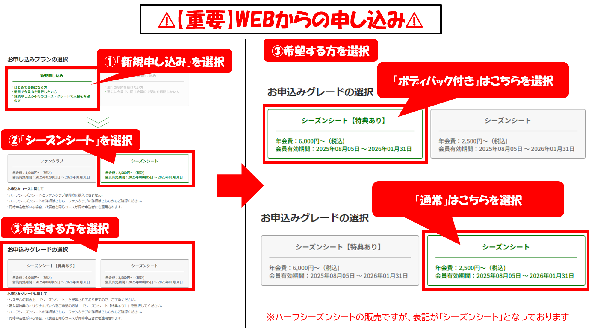 ※ハーフシーズンシートは継続価格はございません。どなた様も「新規」でお申し込みいただきます。