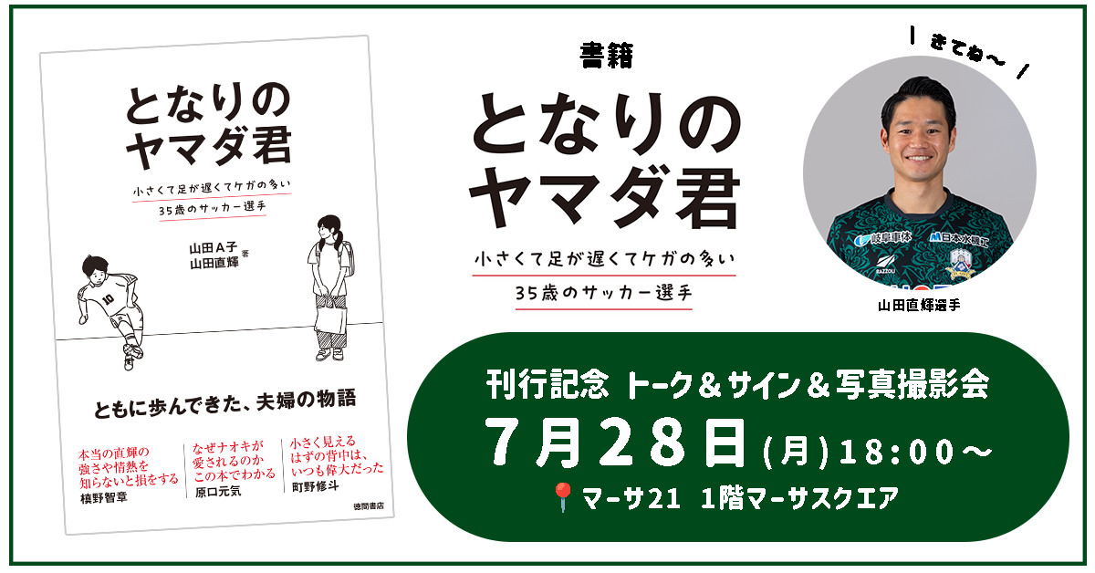 山田直輝選手と、その奥様のA子さんが、共著で『となりのヤマダ君 小さくて足が遅くてケガの多い35歳のサッカー選手』を徳間書店より刊行いたします。その刊行を記念して、トーク&サイン&写真撮影会を開催いたします。