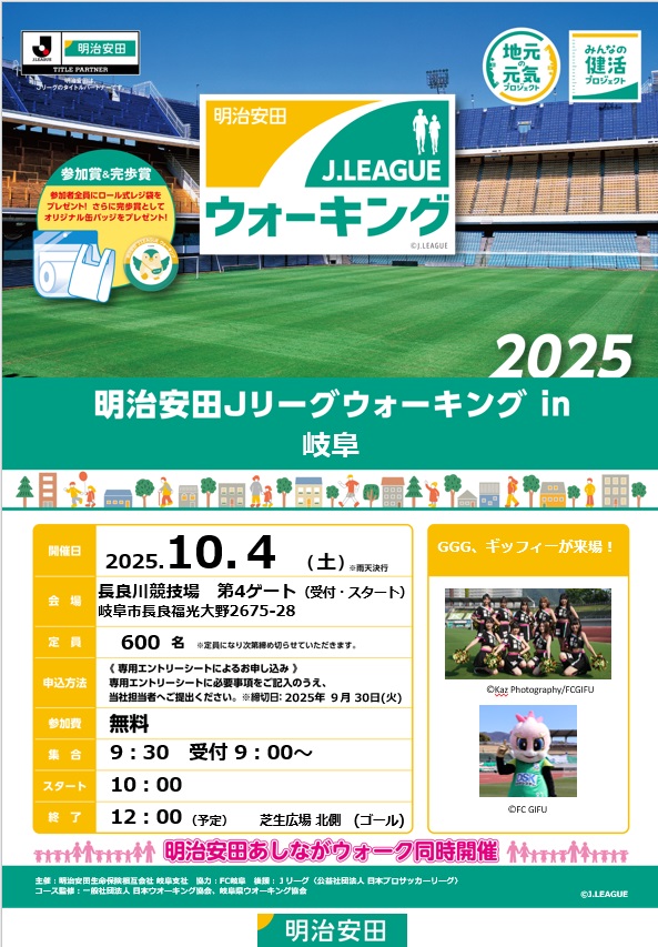 明治安田岐阜支社様主催の「Jリーグウォーキング in 岐阜」を開催!!参加賞・完歩賞もらえます。明治安田&FC岐阜と一緒に健康づくりにとりくもう!!