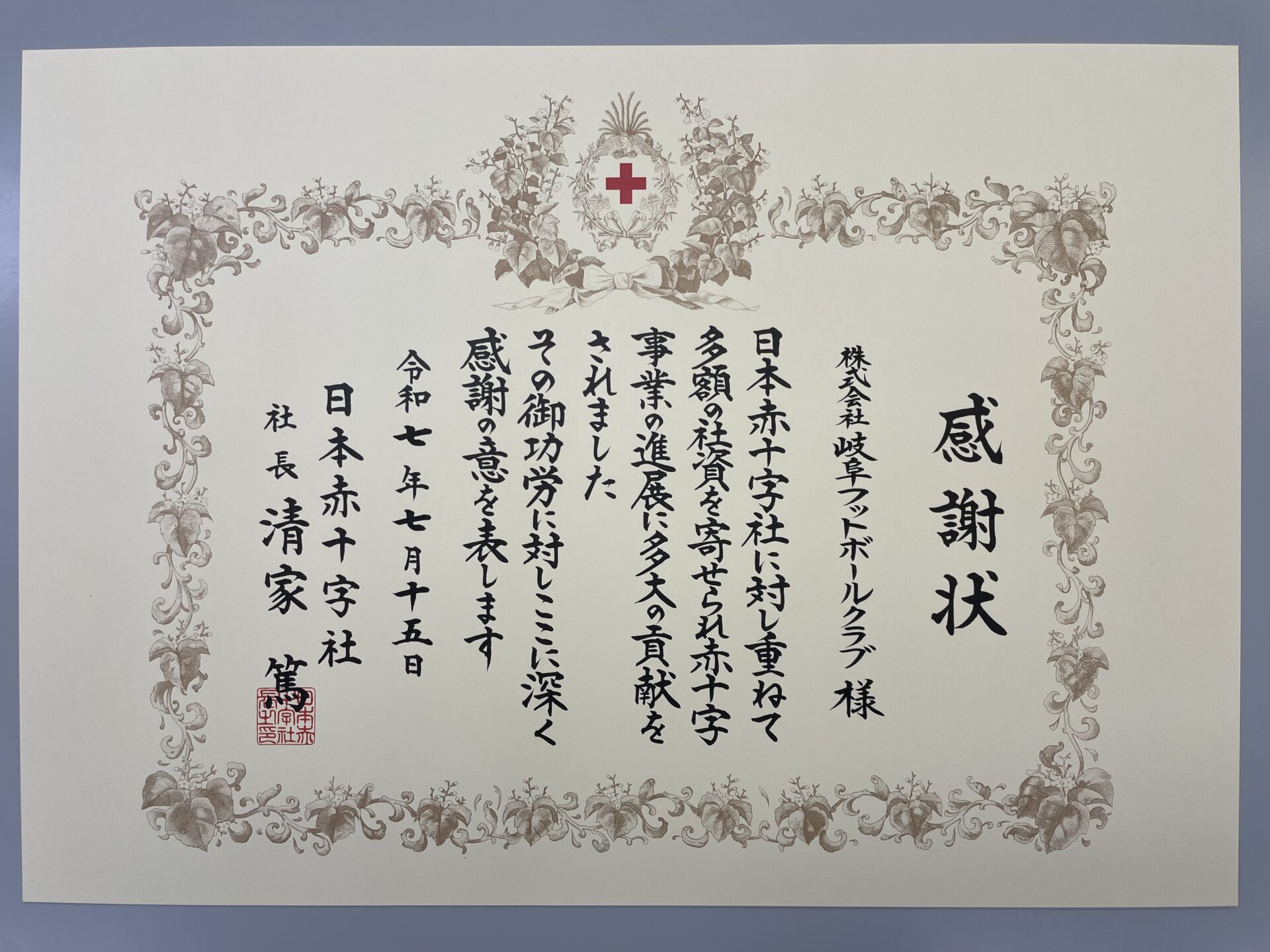 今回の表彰は、「FC岐阜サンクスフェスタ2024 in マーサ21」で実施したチャリティーオークションにて、選手のぼり、選手スパイク、試合着用ユニフォームなどを出品し、ファン・サポーターの皆さまに落札していただいた売上金の一部623,092円を日本赤十字社岐阜県支部へ寄付させていただいたことにより、表彰されたものです。