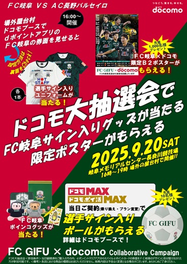 サポーターの皆さんはスマホのdポイントカードをFC岐阜のデザインに変更し、お買い物をしてdポイントをためるだけ!カードはかっこいいエンブレムデザインやかわいいギッフィーデザインなど4種類をご用意しています。≪詳しくはこちら≫デザインを変更していただいた方に抽選会を実施!選手のサイン入りグッズやポインコグッズがあたります。先着1,000名にFC岐阜×ドコモ限定ポスターをプレゼント!