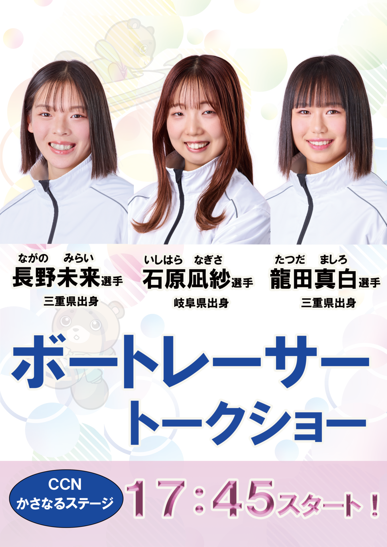 かさなるステージではボートレーサーによるトークショー開催!!話題の若手女子レーサー石原凪紗選手(岐阜県出身)・長野未来選手(三重県出身)・龍田真白選手(三重県出身)が登場!! 選手の魅力や裏話をお楽しみください。マスコットキャラクターのよーたんも遊びにくるよ!!