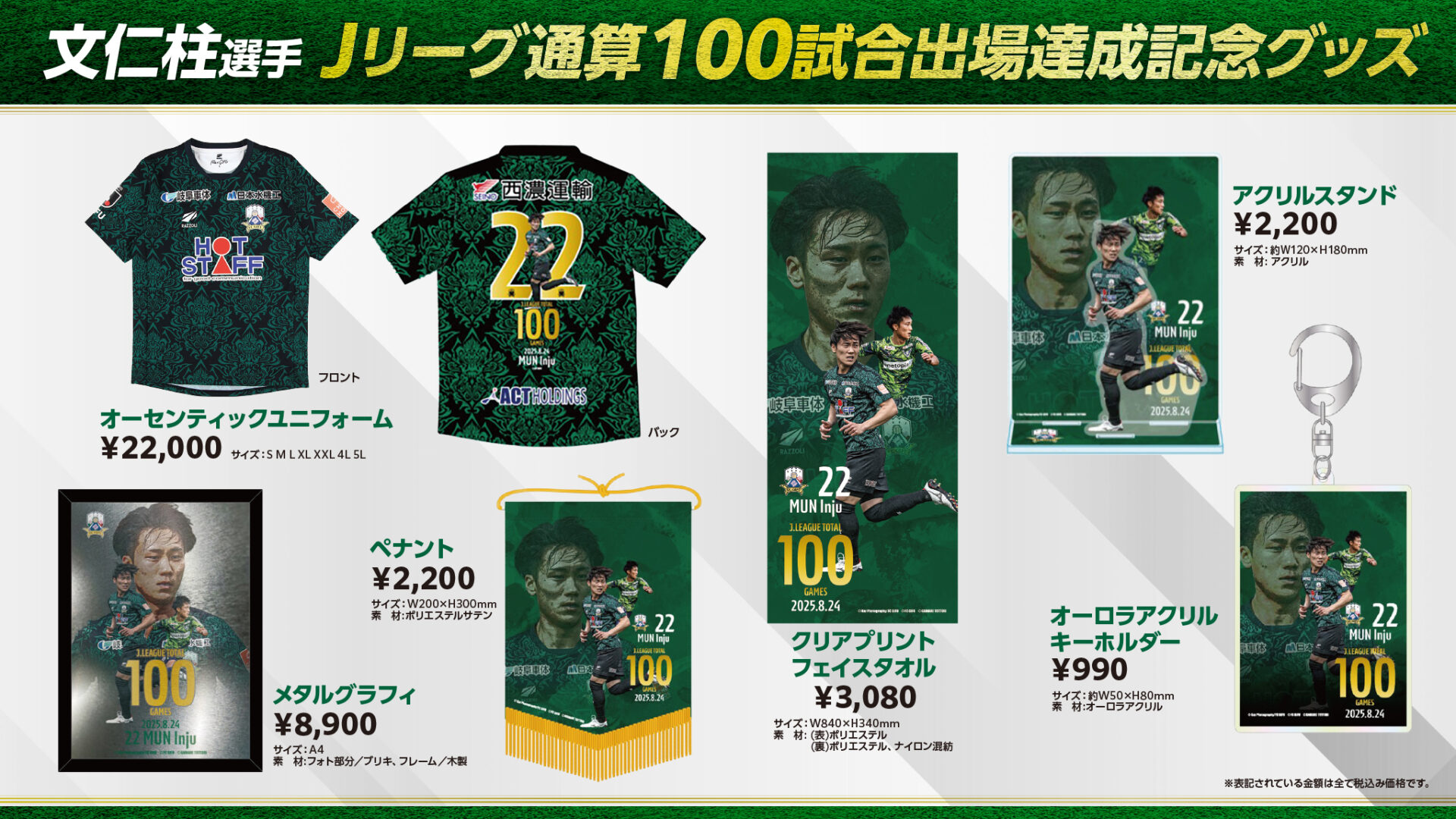 8月24日(日)に開催されました2025明治安田J3リーグ 第24節福島ユナイテッドFC戦において、文 仁柱選手がJリーグ通算100試合出場を達成いたしました。これを記念してグッズの受注販売が決定しましたので、お知らせします。