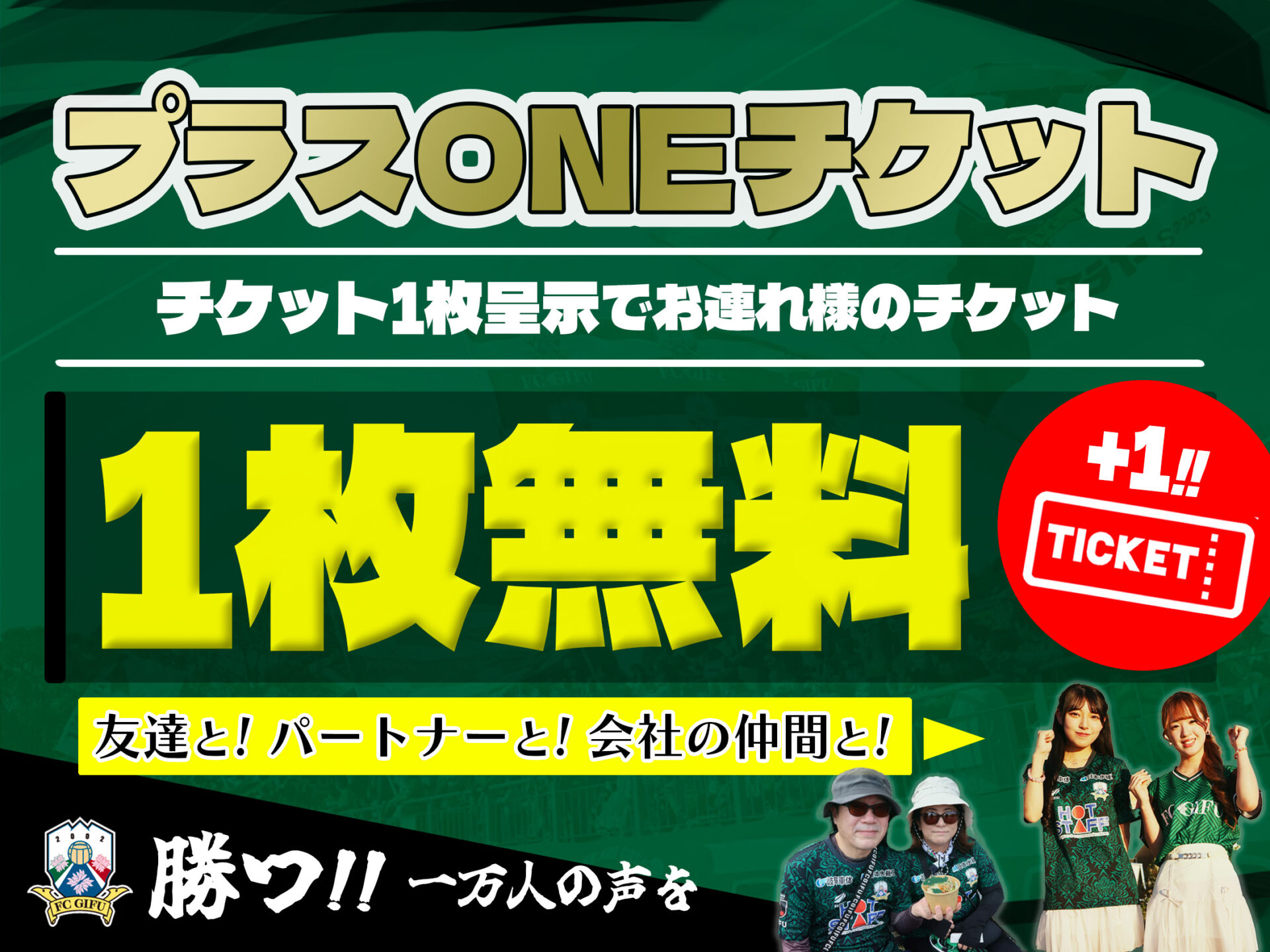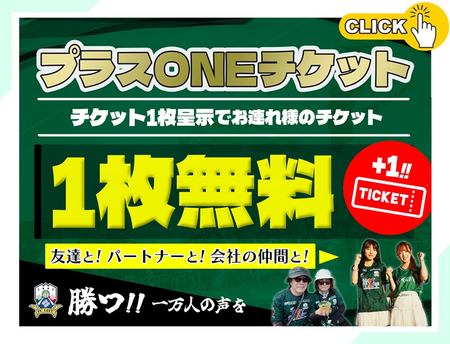 チケットをスタジアムにお持ちいただくと、お連れ様用のチケットを1枚プレゼント!! プラスONEチケット